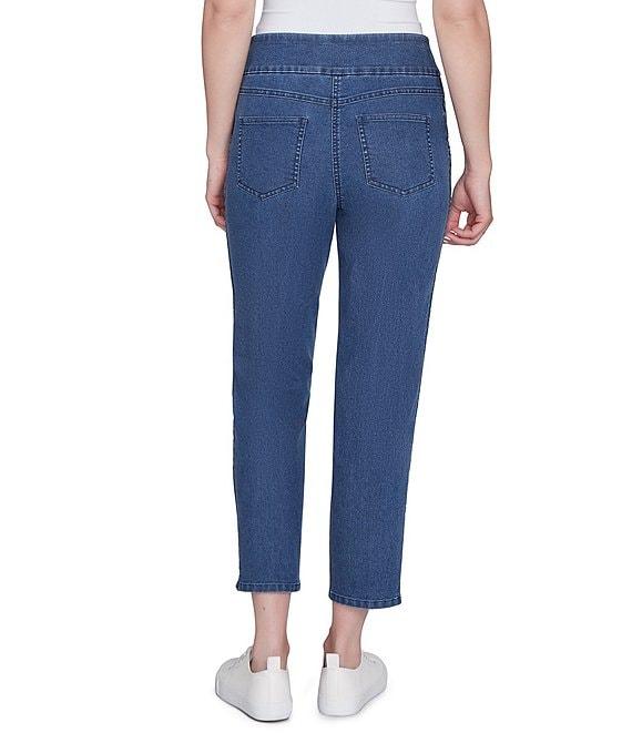 From Ruby Rd., these jeans feature: Stretch denim fabrication Flat front Two front functional and two back patch pockets Straight leg Braid outer leg side detail Pull-on construction Approx. 26.75" inseam Cotton/ polyester/spandex Machine wash cold/tumble dry low Imported. Take your denim to the next level with these pull-on jeans. Featuring a chic braid detail along the side and faux front pockets for a sleek look. Style that stands out, comfort that's all in.