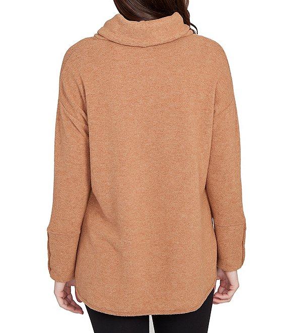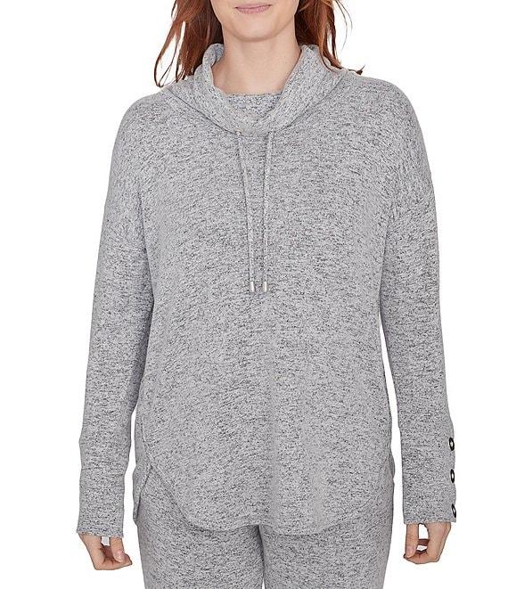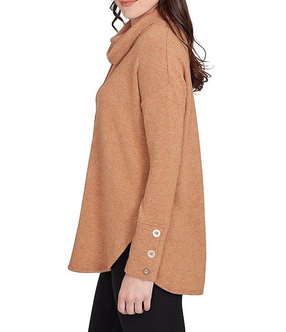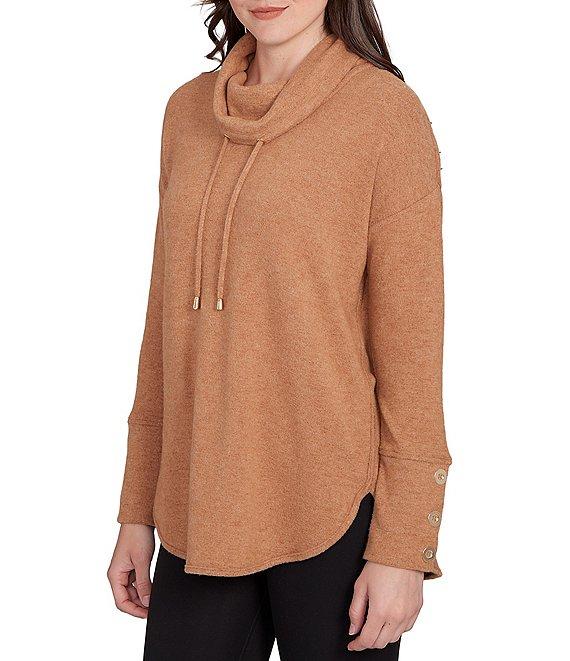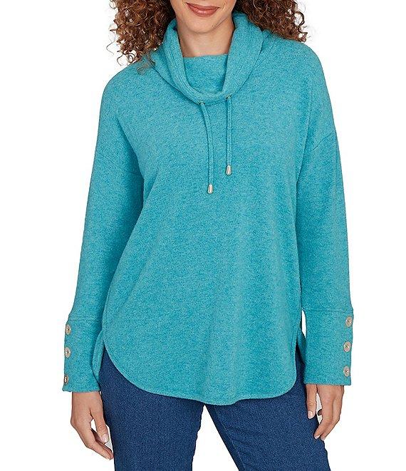 From Ruby Rd. Petite, this sweater features: Ultra-soft heathered knit fabrication Relaxed fit Cowl neckline with tie detail Long sleeves with button detail Dropped shoulders Rounded hemline Pullover construction Polyester/rayon/spandex Machine wash/line dry Imported. Cozy with a side of charm. Made from ultra-soft heathered knit, this relaxed top features a drawstring cowl neckline and statement button cuffs for a polished twist. The rounded hem and long sleeves keep it easy, while subtle details bring the flair. its your new go-to for casual days with a little extra something.