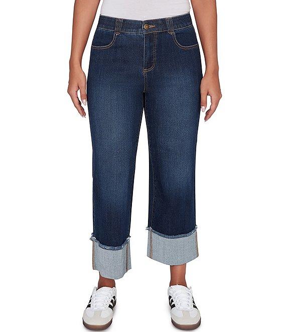 From Ruby Rd. Petite, these jeans feature: Ultra-soft stretch denim fabrication Wide leg Belt loops 5-pocket style Rolled hem can be worn cuffed or uncuffed Button/zip closure Approx. 23.5" inseam cuffed; 28" uncuffed Cotton/polyester/rayon/spandex Machine wash/ tumble dry low Imported. Step up your denim game with these wide leg convertible cuff jeans, designed for comfort, versatility, and timeless style. Made from ultra-soft stretch denim, they feature a sandblasted wash for a lived-in feel, a classic button fly closure, and five-pocket styling. The convertible rolled cuff lets you customize your look to wear it cropped or full-length depending on your vibe. A sleek comfort elastic waistband ensures a flattering, flexible fit all day long. These jeans are the perfect blend of relaxed polish and weekend ease.