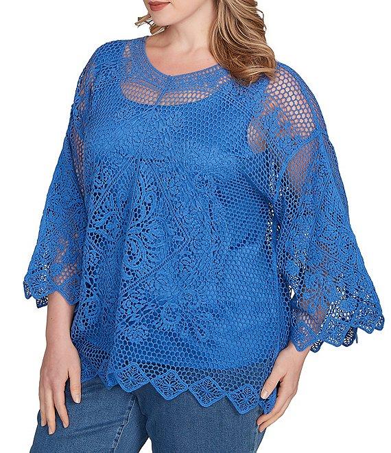 From Ruby Rd. Plus, this top features: Lightweight crochet fabrication Scoop neckline 3/4 wide flared sleeves Medallion pattern with floral and ornamental details Tank lining adds extra coverage and versatility Scalloped edges at hem and sleeves Pullover construction Cotton Hand wash cold/lay flat to dry Imported. Discover the intricate craftsmanship of our lightweight crochet top. The delicate crochet knit features a beautiful medallion pattern with floral and ornamental details, creating a visually captivating piece. A soft tank lining provides comfortable coverage, making it perfect for all-day wear. The classic round neckline complements the wide, flared three-quarter sleeves with scalloped edges. The top is finished with a unique scalloped hemline, adding a touch of artisanal detail and enhancing the feminine silhouette.