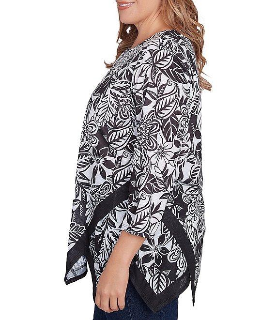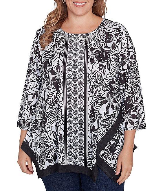 From Ruby Rd. Plus, this top features: Knit fabrication Embellished scoop neckline 3/4 sleeves Mixed print Contrast trim Flowy shark-bite hemline Pullover construction Polyester Machine wash/line dry Imported. Prepare to feel your best while wearing our sublimation printed top. Designed with a embellished scoop neckline, a flowy shark bite hemline, and three-quarter sleeves for the most comfort.
