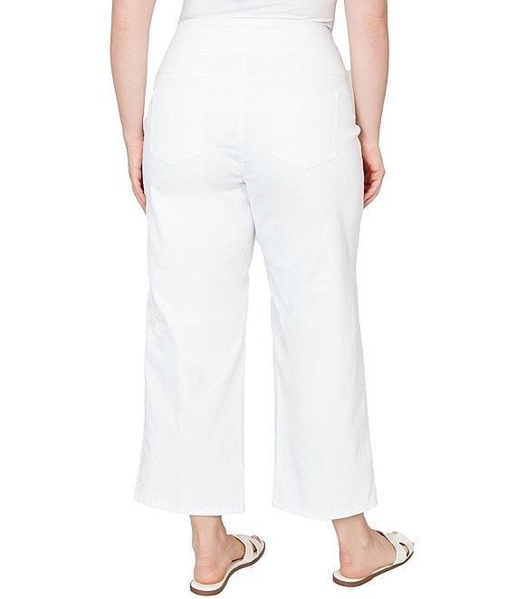From Ruby Rd. Plus, these jeans feature: Lightweight stretch denim fabrication Wide elasticized waistband Straight leg Delicate side embroidery Functional coin pocket and back pockets Pull-on construction Approx. 28.75" inseam Cotton/polyester/spandex Machine wash/tumble dry Imported. These easy pull-on jeans have the structure of denim with the feel of a favorite leggings. Made in lightweight stretch denim, it features a flattering stovepipe leg, delicate side cording embroidery, and functional back and coin pockets. Comfy, detailed, and totally wearable.