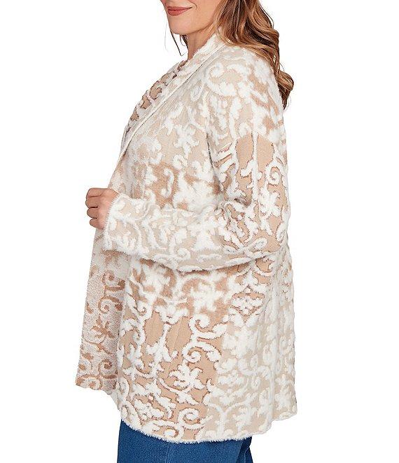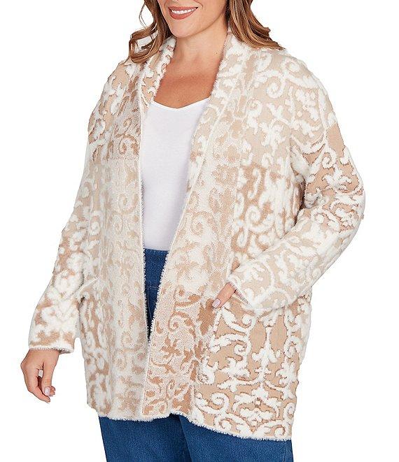 From Ruby Rd. Plus, this cardigan sweater features: Eyelash yarn, jacquard knit fabrication Shawl neckline Long sleeves Vintage scroll pattern Patch pockets Open-front; no closure Approx. 30.5" length Polyester/rayon/nylon Hand wash cold/dry flat Imported. This cozy open-front cardigan features eyelash yarn jacquard knit with a vintage scroll pattern and handy patch pockets. Long sleeves and a drapey silhouette make it an everyday favorite with flair.