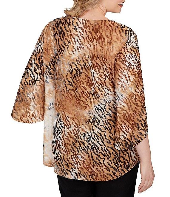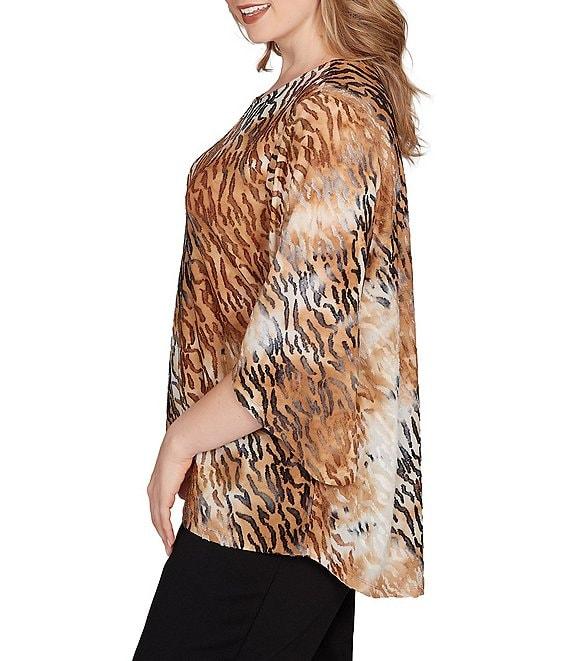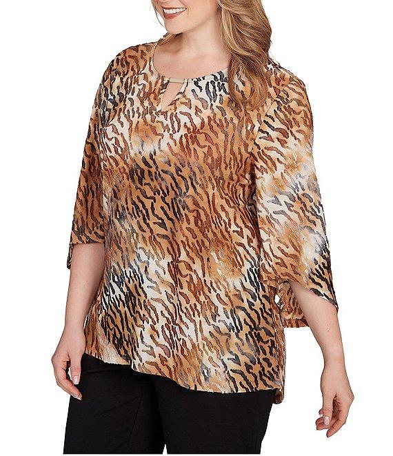 From Ruby Rd. Plus, this top features: Jacquard knit fabrication Keyhole neckline with bar detail 3/4 sleeves Tie-dye zebra print Breezy crossover hem Pullover construction Polyester/rayon/spandex Machine wash cold Imported. Wild style, softened. With loose bell sleeves, a breezy crossover hem, and a gold bar at the split neckline, this jacquard knit top brings bold texture and subtle shimmer. The tie-dye zebra print adds just the right edge-easy, airy, and full of flair.