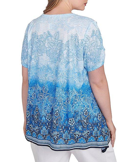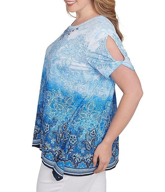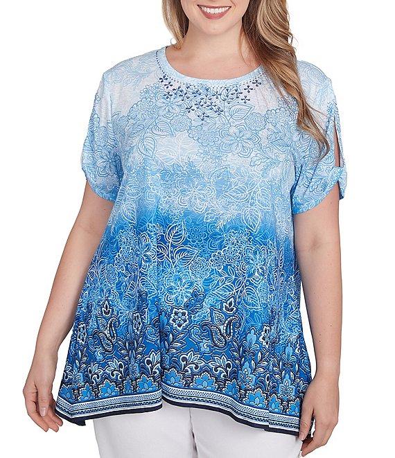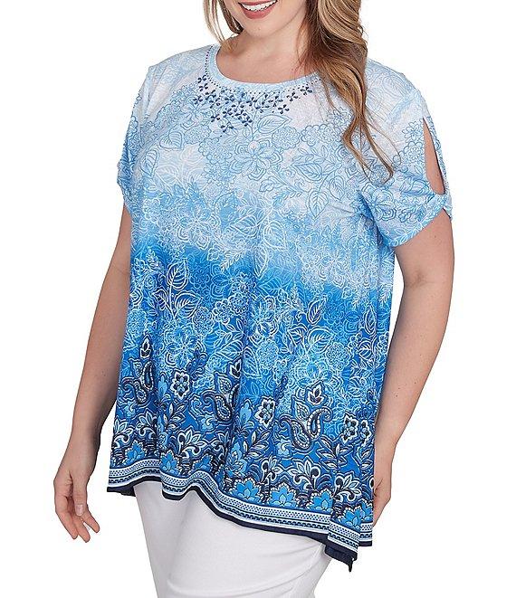 From Ruby Rd. Plus, this top features: Soft and comfortable jersey fabrication Scoop neckline Short sleeves with a cut-out detail Ombre print Embellishment detail Pullover construction Polyester Machine wash/tumble dry Imported. This stylish top features a vibrant ombre print that transitions from a pale hue to a deeper shade, creating a captivating visual effect. The scoop neckline is adorned with delicate embellishments for a touch of glamour, while the short sleeves with cutouts offer a modern and feminine look. The sharkbite hem adds a touch of personality, and the soft and comfortable jersey fabric ensures a flattering fit.