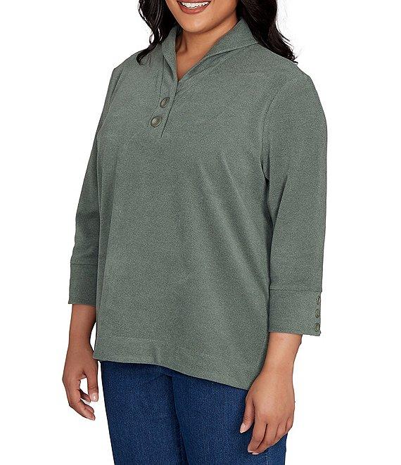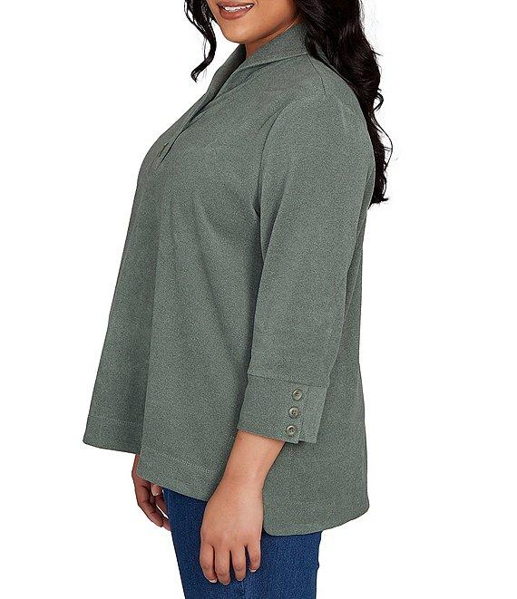From Ruby Rd. Plus, this top features: Luxe rib knit fabrication Y-neckline 3/4 sleeves Buttoned collar and cuffs Straight hem with side slits Pullover construction Polyester/spandex Machine wash cold/tumble dry low Imported. Simple, sleek, and made to move. Crafted from a luxe stretch rib knit, this top pairs polish with comfort. The buttoned collar and cuff details add a tailored touch, while 3/4 sleeves and side slits keep the fit easy and flattering. Its polished enough to dress up, but comfy enough to live in.