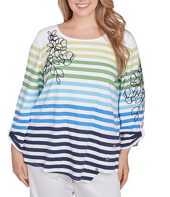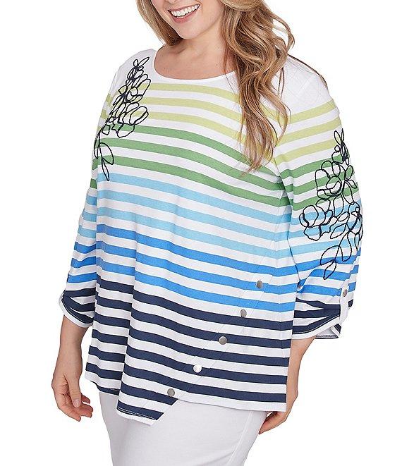 Ruby Rd. Plus Size Mixed Color Stripe Soft Knit Floral Embroidered Detail Scoop Neck 3/4 Sleeve Top
