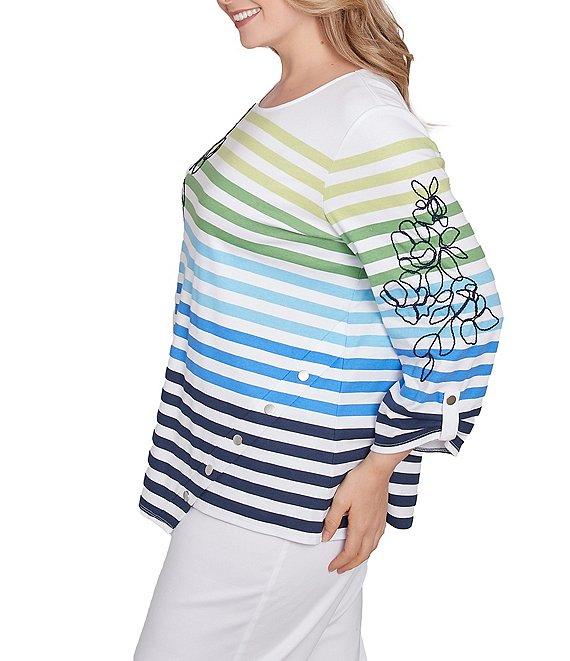 From Ruby Rd., this top features: Soft comfort and sophistication knit fabrication  Scoop neckline  3/4 roll-tab sleeves Stripe print  The floral cording embroidered add a touch of feminine charm Diagonal button tab detail Asymmetrical hemline Pullover construction Cotton Machine wash cold/line dry  Imported. Embrace effortless style with this unique must-have top. Crafted from soft fabric, this top offers both comfort and sophistication. The floral cording embellishments add a touch of feminine charm, while the button details at the side provide a unique and stylish element. Fun mixed color stripes add a fun edge to the design while the cuffed three-quarter sleeves complete the look with a touch of classic elegance.