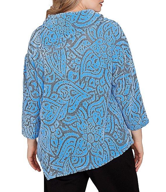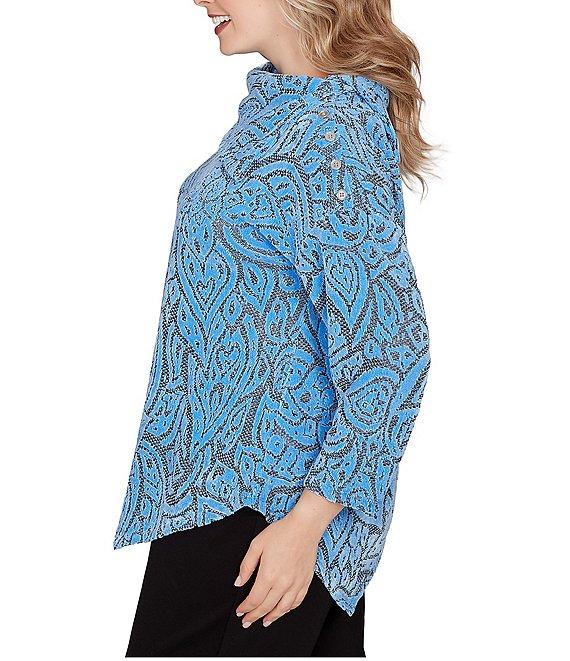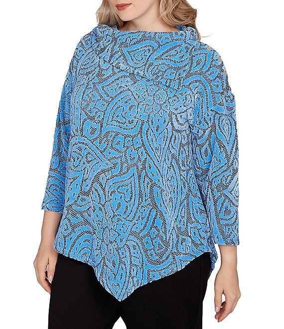 From Ruby Rd. Plus, this top features: Jacquard knit fabrication Split cowl neckline 3/4 sleeves Paisley print Button detail at shoulder Asymmetrical hem Pullover construction Polyester Machine wash cold/tumble dry low Imported. A romantic paisley jacquard print, chenille softness and a flowy asymmetrical hem make this top feel so special. Finished with 3/4 sleeves, seaming details and a soft cowl neckline for an elegant everyday look.