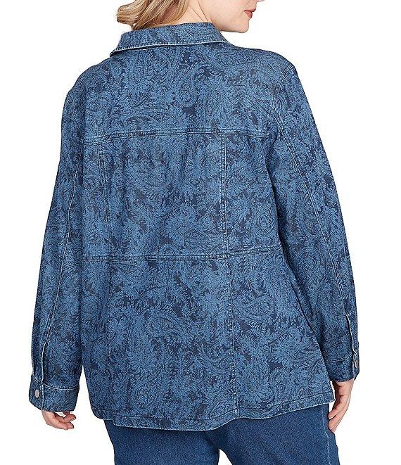 From Ruby Rd. Plus, this jacket features: Denim fabrication Point collar Long sleeves with button cuffs Paisley print Functional front pockets Button-front closure Approx. 25" length Tencel™ lyocell/polyester Machine wash/tumble dry Imported.