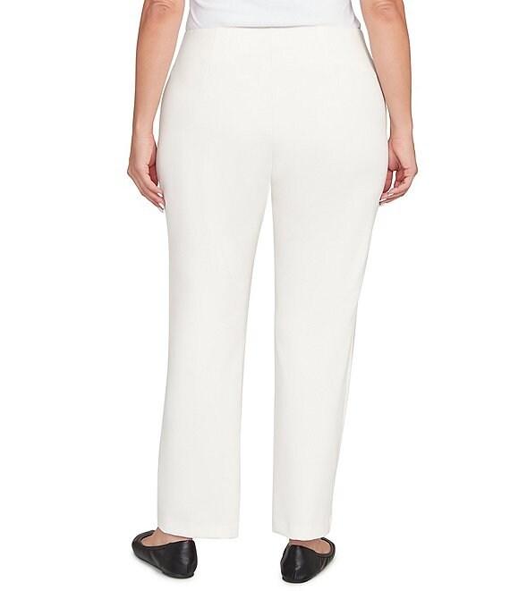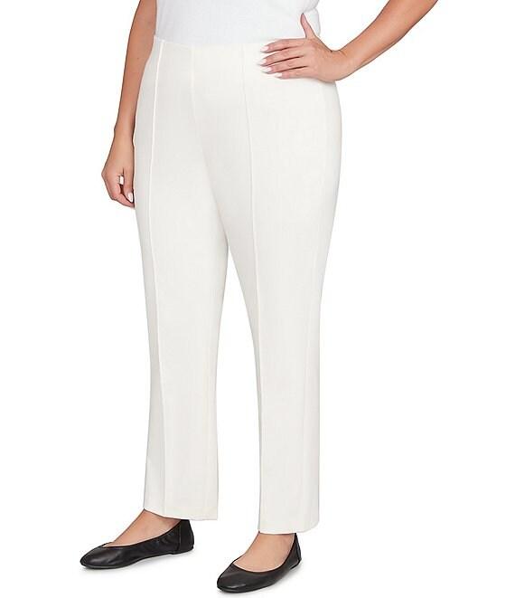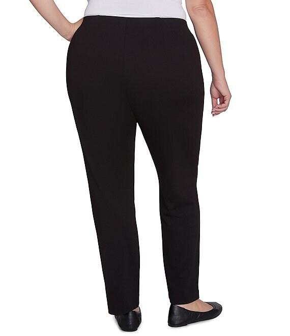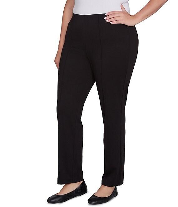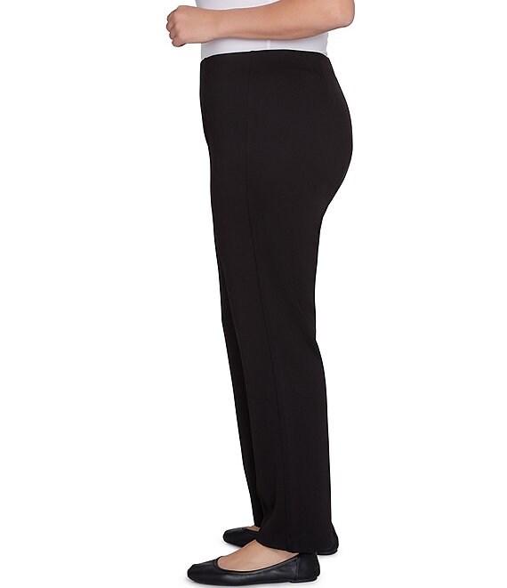 From Ruby Rd. Plus these pants feature: Ponte knit stretch fabrication Elasticized waistband Pintuck detail Pull-on construction Approx. 30.75" inseam Polyester/rayon/spandex Machine wash/tumble dry Imported. Sleek style meets effortless comfort in this versatile pant The Hollywood waistband sits smooth from hip to waist for a clean, flattering look. Crafted in ponte knit for structure with plenty of stretch, these pants are made to move with you.