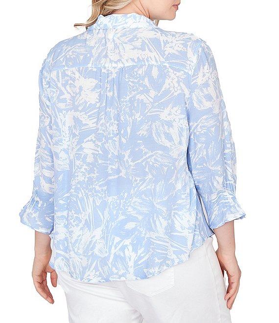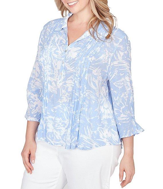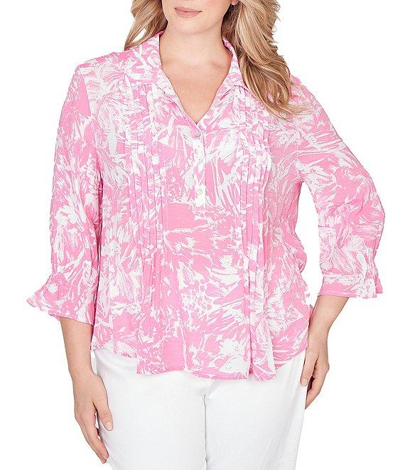From Ruby Rd. Plus, this top features: Silky slub woven fabrication Collared v-neckline 3/4 sleeves Brushstroke floral print Relaxed fit Delicate front pleats Partial button closure Rayon/polyester Machine wash/tumble dry Imported. Printed with a painterly brushstroke floral, this silky slub popover top features delicate pleats and a partial button front. Designed with a collared neckline, elastic-cuffed 3/4 sleeves, and a relaxed silhouette that flows with you.
