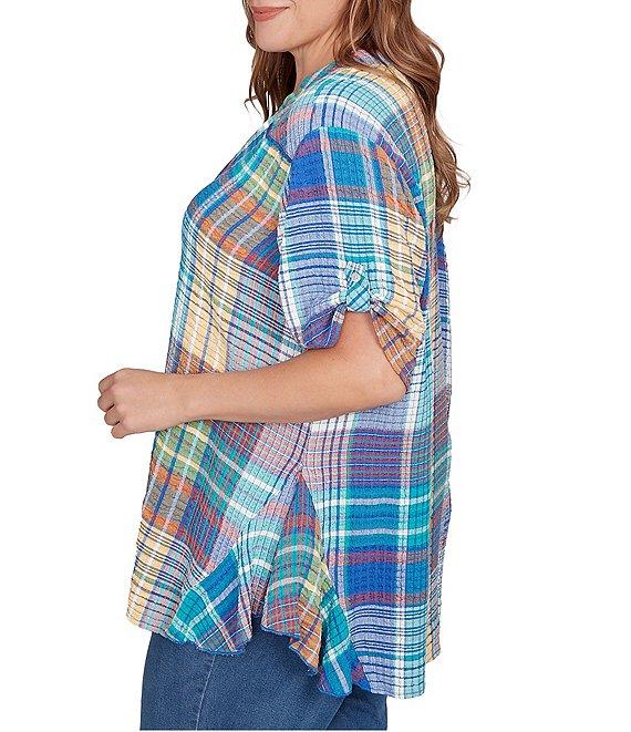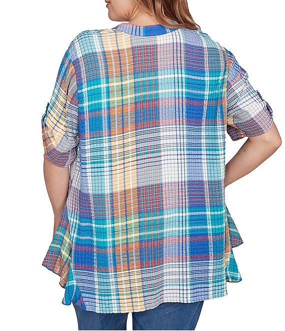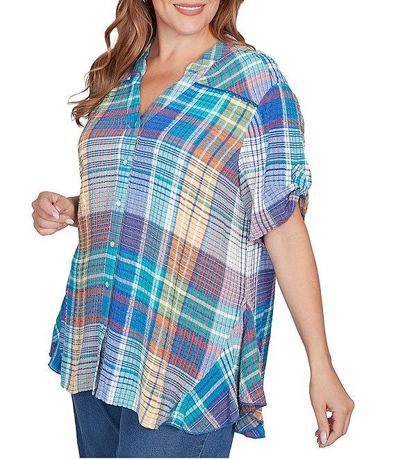 From Ruby Rd. Plus, this shirt features: Soft crinkle fabrication Y-neckline Short sleeves with button tabs Plaid print Curved hem Button-front closure Rayon/polyester/spandex Machine wash Imported. Enjoy all-day comfort with our crinkle plaid button-front top. The soft, crinkled plaid fabric provides a relaxed and comfortable fit. The button-down front offers easy wear and versatile styling, while the V-neckline adds a feminine touch. Short sleeves with button tabs allow for adjustable styling, and the curved hemline ensures a flattering drape. A single chest pocket adds a practical detail to this stylish and comfortable top.