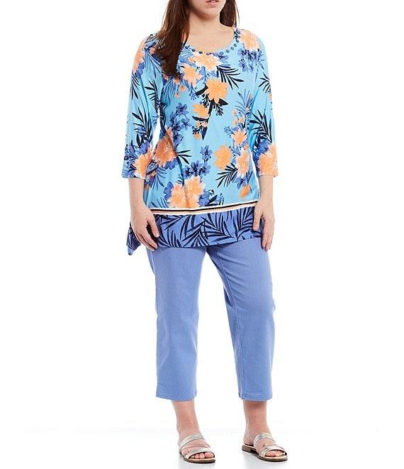 From Ruby Rd. Plus, these pants feature: flat front silhouette Wide waistband Straight leg Slit hem details Functional back pockets Pull-on construction Approx: 28" inseam Cotton/polyester/spandex Machine wash Imported.