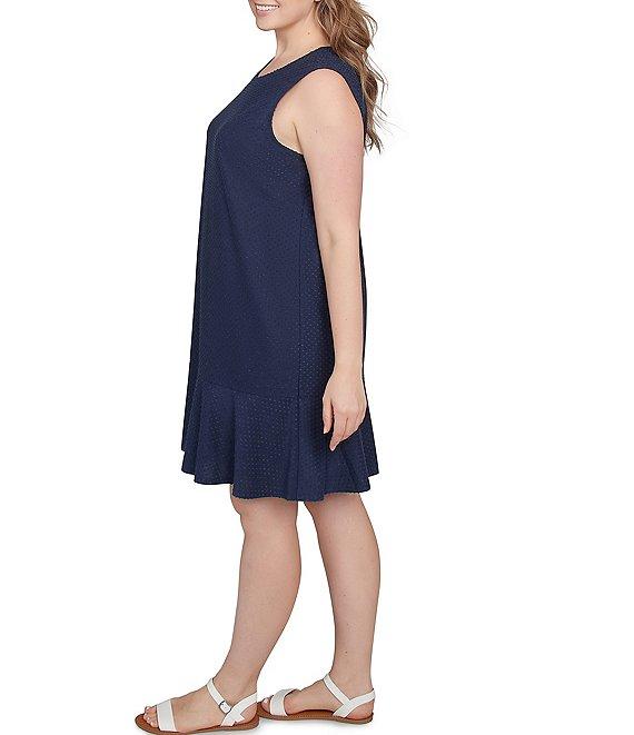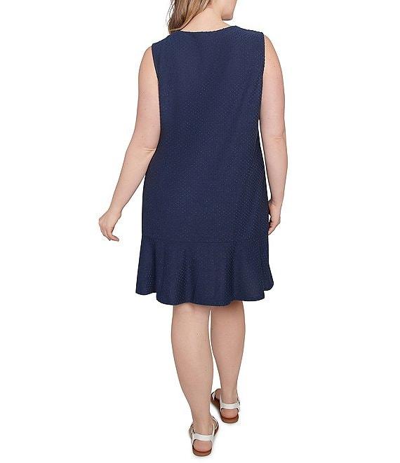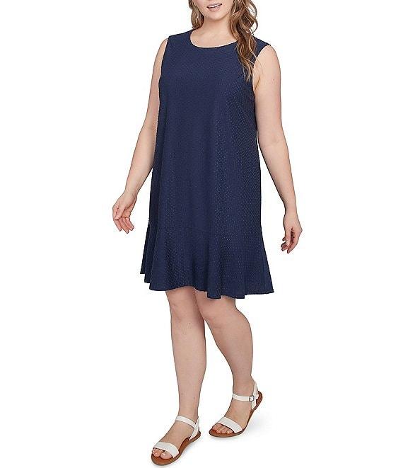 From Ruby Rd. Plus, this dress features: Shift silhouette Scoop neckline Sleeveless Swiss dot pattern Tiered hem Pullover construction Approx. 38" length Polyester Machine washable Imported. Stay cool and stylish with our Swiss Dot Peplum Dress. The sleeveless design and boat neckline offer a classic look, while the peplum hemline and Swiss dot pattern add a touch of personality. The soft, comfortable fabric ensures all-day comfort.