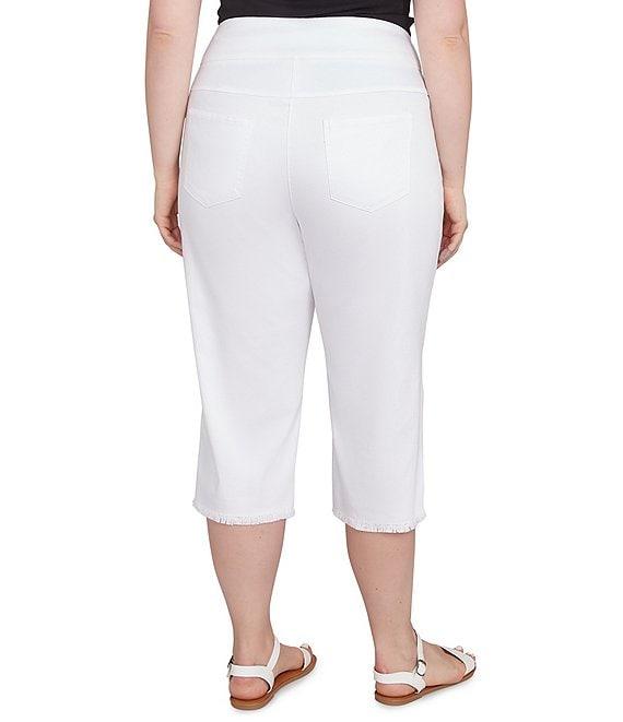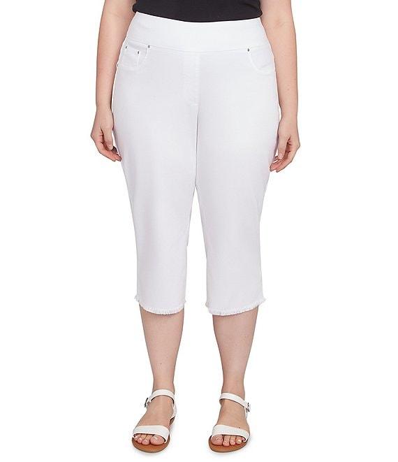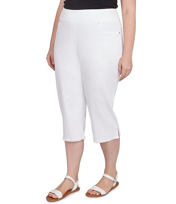 From Ruby Rd. Plus, these pants feature: Soft, breathable fabrication Elasticized waistband Functional pockets Back patch pockets Fringe hem with side slits Pull-on construction Approx. 21" inseam Tencel ™ Lyocell/polyester Machine wash/line dry Imported. Our Tencel(TM) Denim Pull-On Capri offers a fresh take on a timeless silhouette. Crafted from luxurious Tencel(TM) Lyocell, these capris are incredibly soft, breathable, and durable. The pull-on design ensures a comfortable fit, while the fringe hem adds a touch of bohemian flair. The capri length offers a flattering fit that can be dressed up or down, and the functional pockets make these denim capris the perfect classic piece.