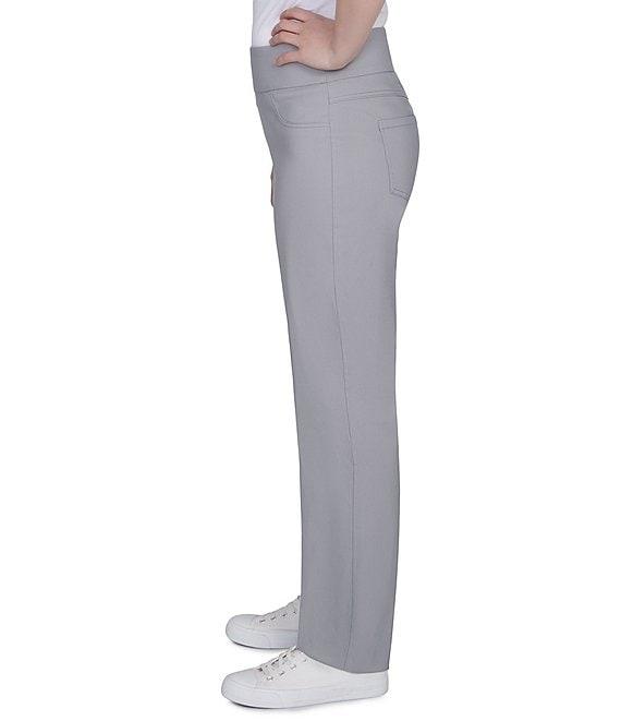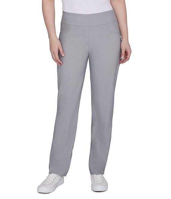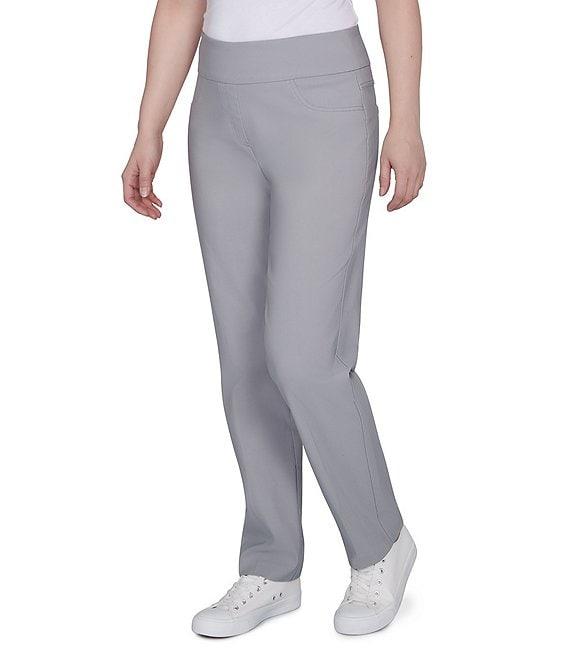From Ruby Rd., these pants feature:Silky soft fabrication Straight leg silhouetteWide waistbandFaux front pocketsBack functional pocketsPull-on constructionApprox. 30" inseam Rayon/nylon/spandexMachine wash/tumble dryImported.Go casual or ever-so-dressy in these silky-soft tech pants detailed with straight legs and pull-on ease.