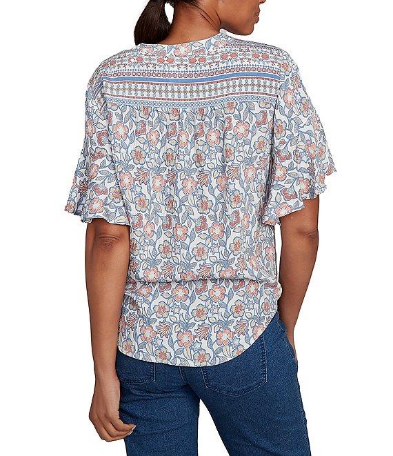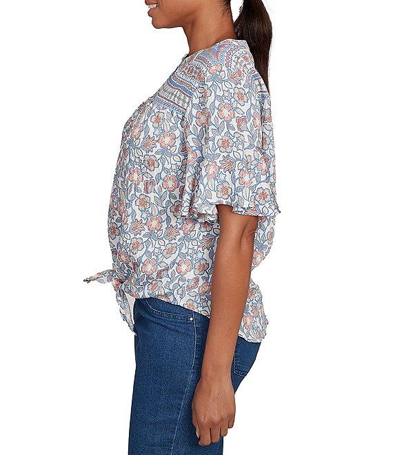 From Ruby Rd., this top features: Silky voile fabrication Round neckline Short flutter sleeves Sarasa floral border print Tie-front hemline Pullover construction Rayon/nylon Machine wash Imported. Add a touch of feminine charm to your wardrobe with this silky voile top. The unique Sarasa floral border print creates a captivating visual appeal. The henley neckline adds a casual touch, while the tie front detail enhances the silhouette. Crafted from lightweight voile, this top offers a luxurious feel and a comfortable fit.