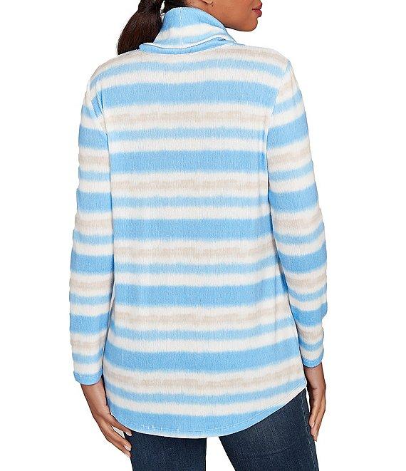 From Ruby Rd., this top features: Soft ribbed knit texture fabrication Draped cowl neckline Long sleeves Stripe print Two front patch pockets Pullover construction Polyester/rayon/spandex Machine wash cold/dry flat Imported. Effortlessly chic, this striped knit top features a cozy draped cowl neckline, soft printed rib texture, and functional front patch pockets. Long sleeves complete the look for chilly days out.