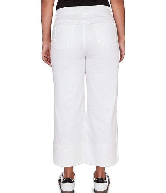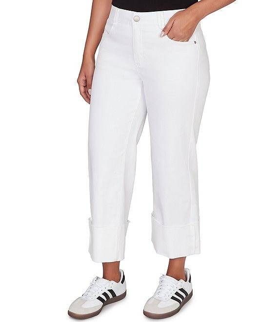 From Ruby Rd. Petite, these denim jeans feature: Soft stretch denim fabrication Wide leg Belt loops 5-pocket styling Relaxed fit Rolled cuff hem Button/zip closure Approx. 23.5" cuffed inseam; 28" uncuffed Cotton/polyester/rayon/spandex Machine wash/tumble dry Imported. Brighten your wardrobe with these white wide leg jeans, crafted in soft stretch denim for a flattering, flexible fit. Designed with a comfortable hidden elastic waistband and a classic button fly, these jeans combine everyday ease with elevated style. The convertible rolled cuff hem adds a playful twist, wear them cropped for warmer days or full-length for polished appeal. Finished with subtle sandblasting and five-pocket styling, these jeans are a must-have neutral that pairs effortlessly with everything in your closet.