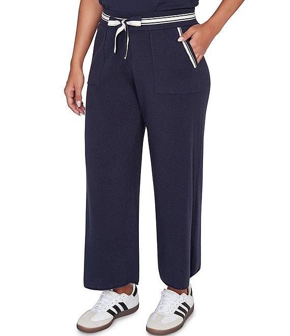 From Ruby Rd., these sweater pants feature: Wide-leg Wide waistband with a drawstring Side pockets Contrast striping along the waistband and pockets Straight hem Pull-on construction Approx. 25.75" inseam Rayon/polyester/nylon Hand wash cold Imported. Easy, athletic, and just a little bold. This cropped ankle pant features sporty contrast striping along the pockets, waistband, and side seams for a modern edge. Finished with a comfy drawstring waist and patch pockets.