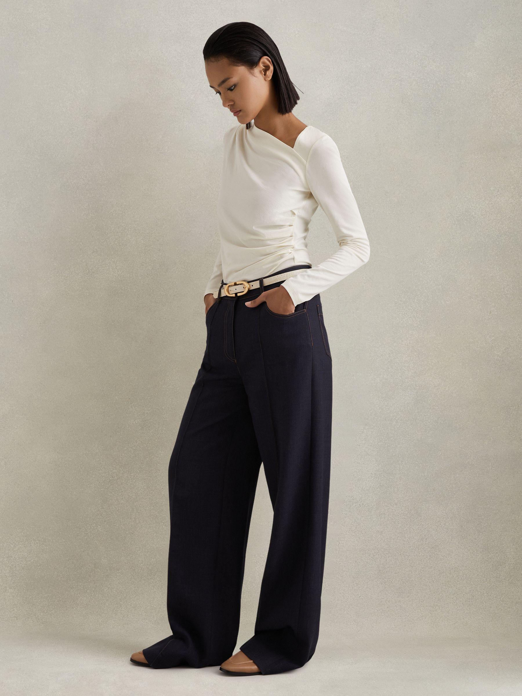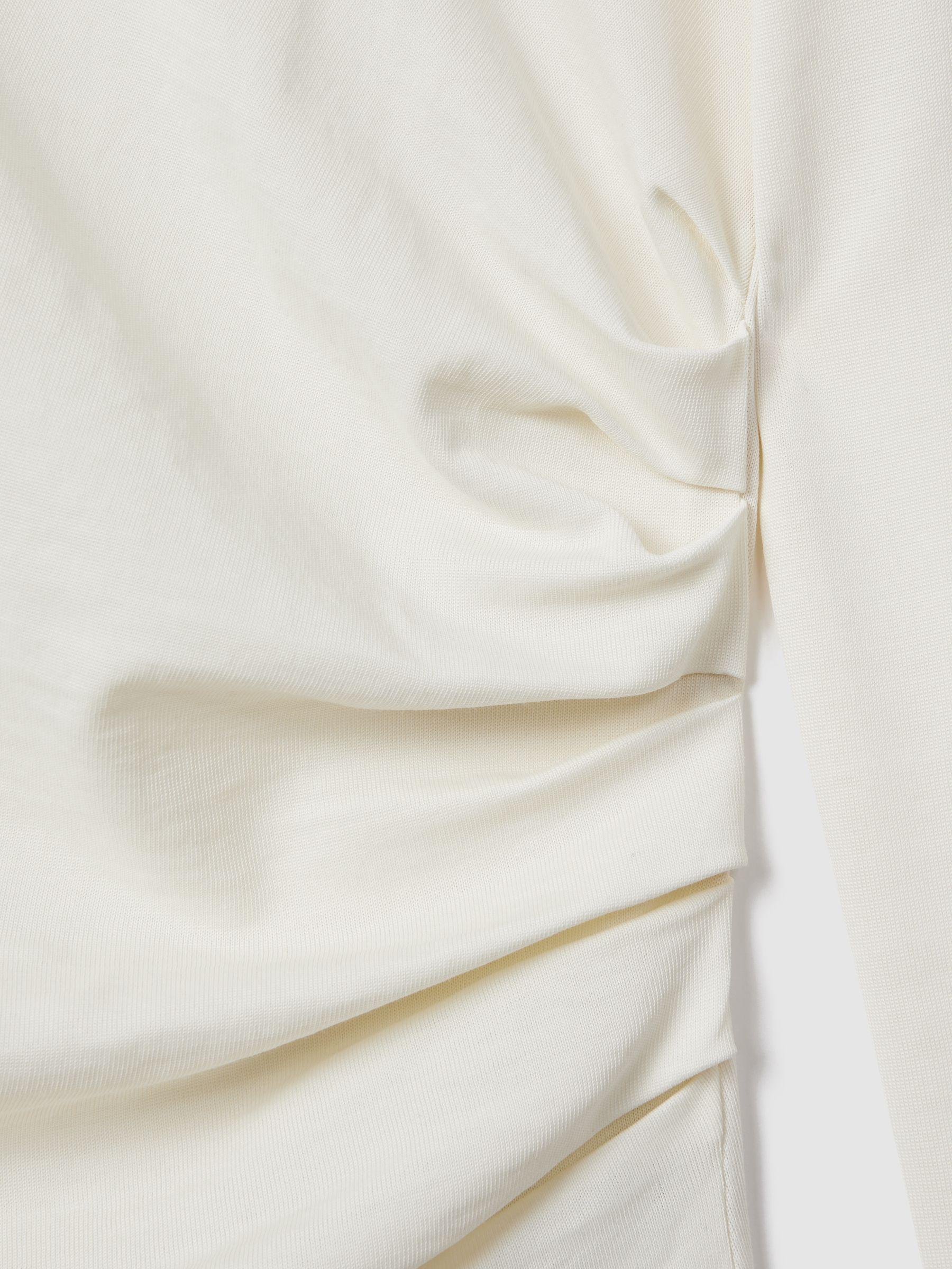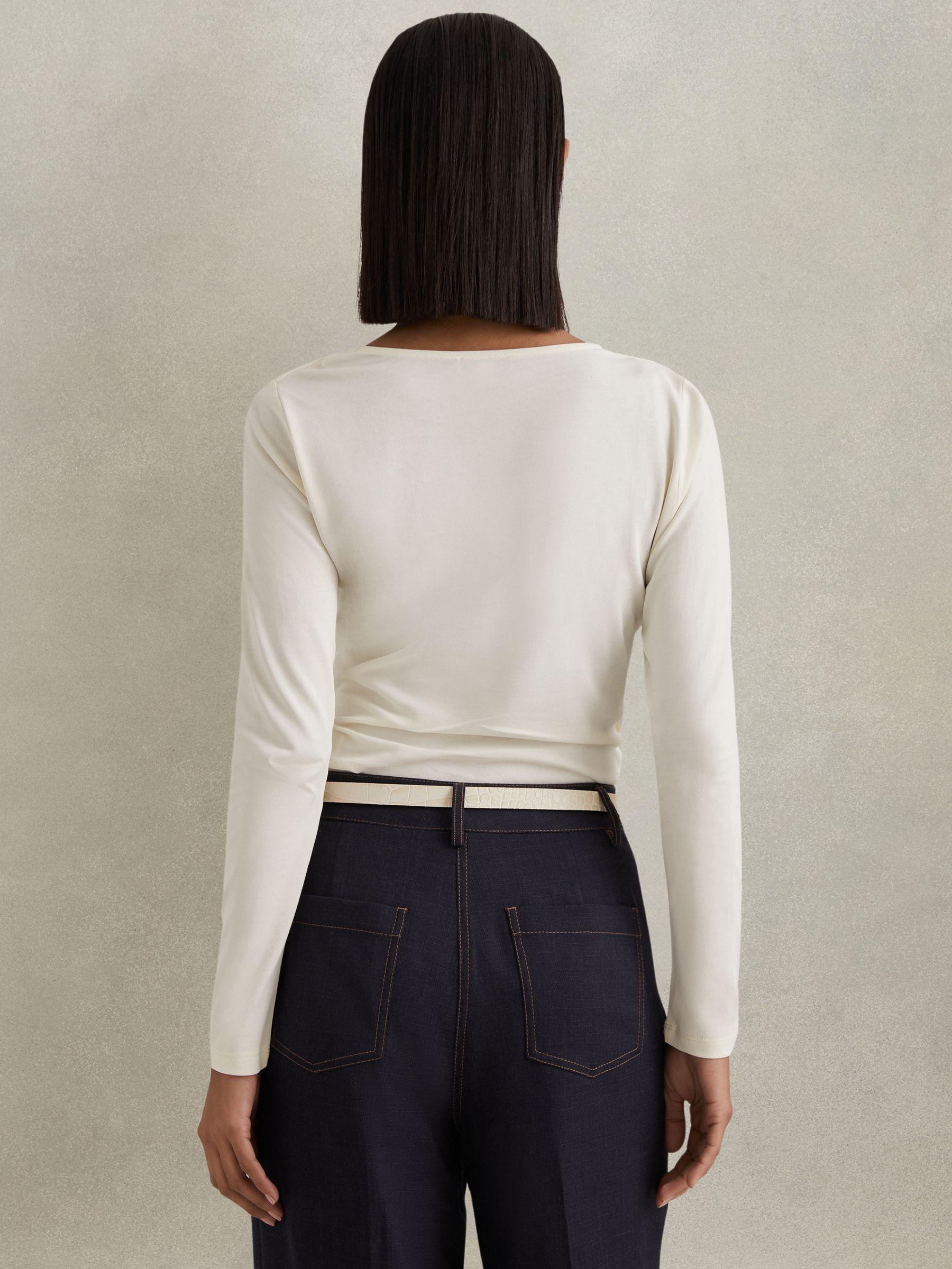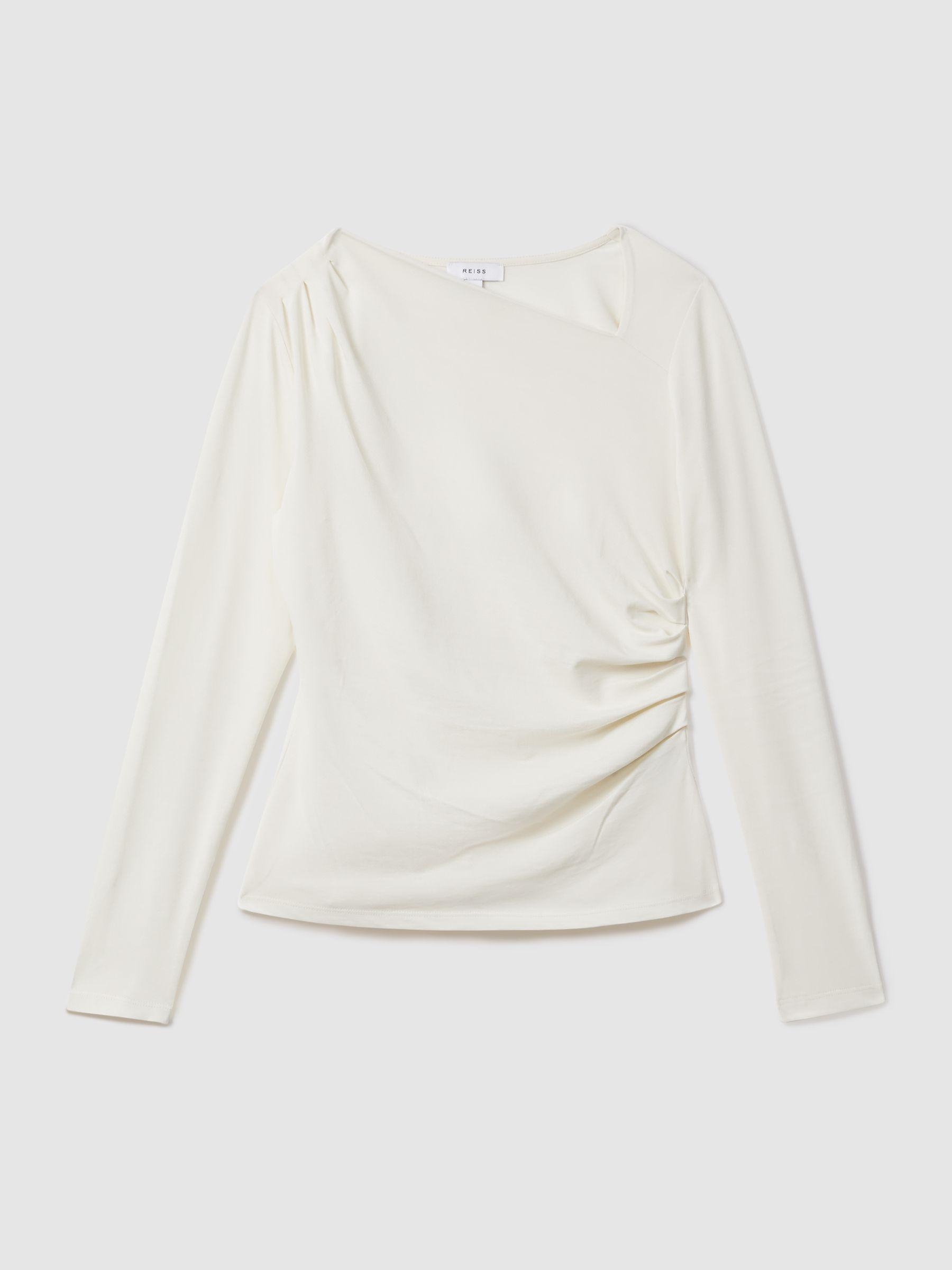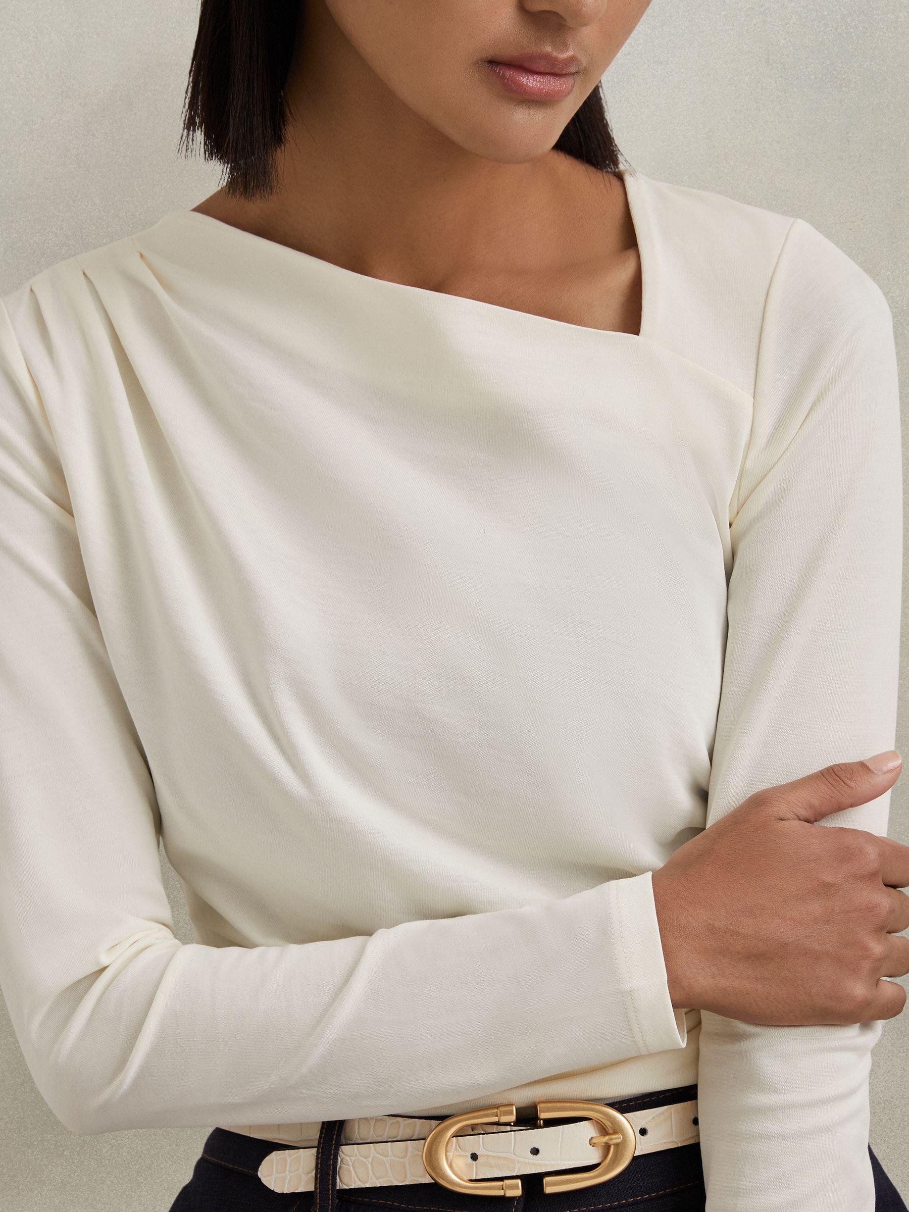 Designed with an asymmetric neckline, the Sandy top offers ample stretch and a slight sheen. Ruche detailing features to the waist and shoulder for a fitted silhouette. Made with cotton. Asymmetric neckline. Ruched detailing. Fitted. The model is wearing a size S. Measurements of model: Height 5ft 9" / 175cm.