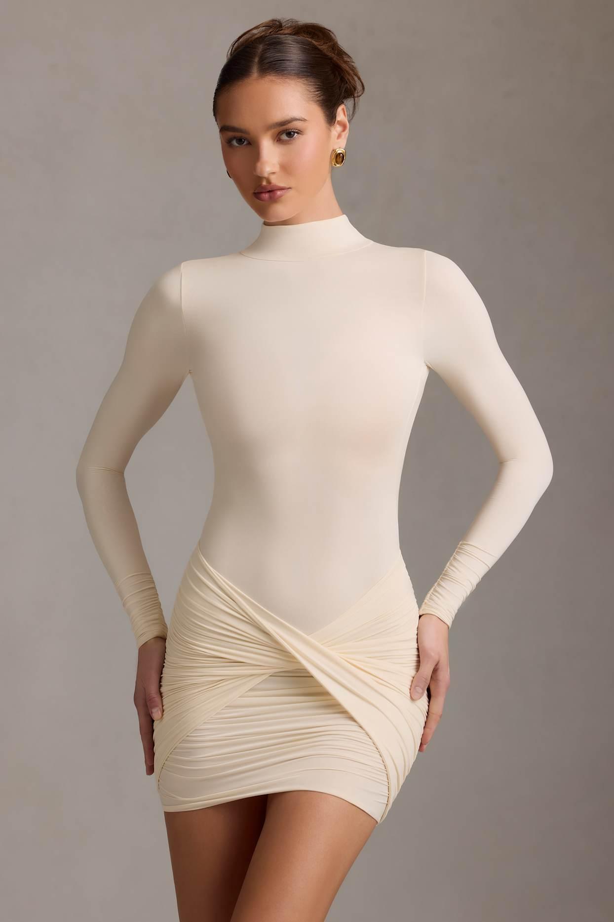 Staples with a twist. Imagined in two neutral hues for versatile styling as part of your capsule wardrobe, the Isolde mini dress is crafted from premium sheer jersey with a soft-touch, lightweight feel, perfect for transcending seasons. Cut to a figure-hugging turtleneck silhouette, it’s elevated with ruching, twist-front detailing and features a statement open back.TurtleneckLong fitted sleevesRuched twist-front detailingOpen backPull-on designBodycon silhouetteWe recommend styling with nipple covers from our Intimates collection for enhanced coverageMini length, SNP to hem approx. 82cm based on a size SProduct code: 13308Designed in London, Crafted In-House.We pride ourselves on quality and owning every step of production because you deserve the best.