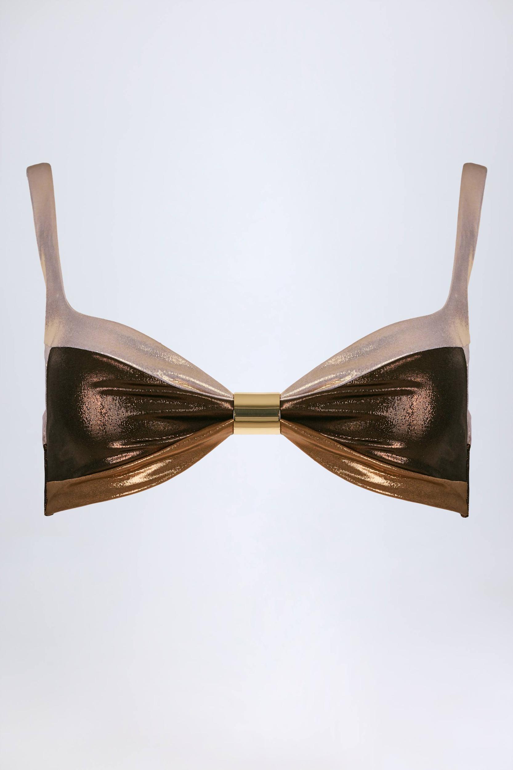 Made to stand out, the Palmita bikini top is crafted from our premium foiled jersey. It features a sweetheart neckline, ruched detailing, and a contrasting panelled bust design, perfect for taking you from poolside to party. It’s complete with adjustable shoulder straps and a clasp fastening for a secure fit.• Sweetheart neckline• Adjustable shoulder straps• Ruched bust• Contrast cup panelling• Clasp fastening at back• Standard bikini top length, side seam approx. 7.5cm, cup depth approx. 11.5cm based on a size S• Product code: NS10601