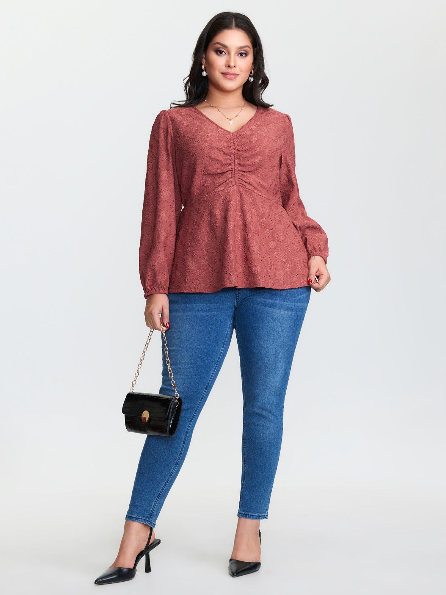 Shop Ruched Bodice Textured Adjustable Knit Top now and redefine your style with confidence at BloomChic. Tailored for mid and plus-size women. This trendy Tops Women, sizes 10-30. Color:Russet;Style:Timeless;Prints:Synthetic texture;Neckline:V-neck;Sleeve Type:Lantern Sleeve;Details:Texture, Gathered;Pocket:No-pocket