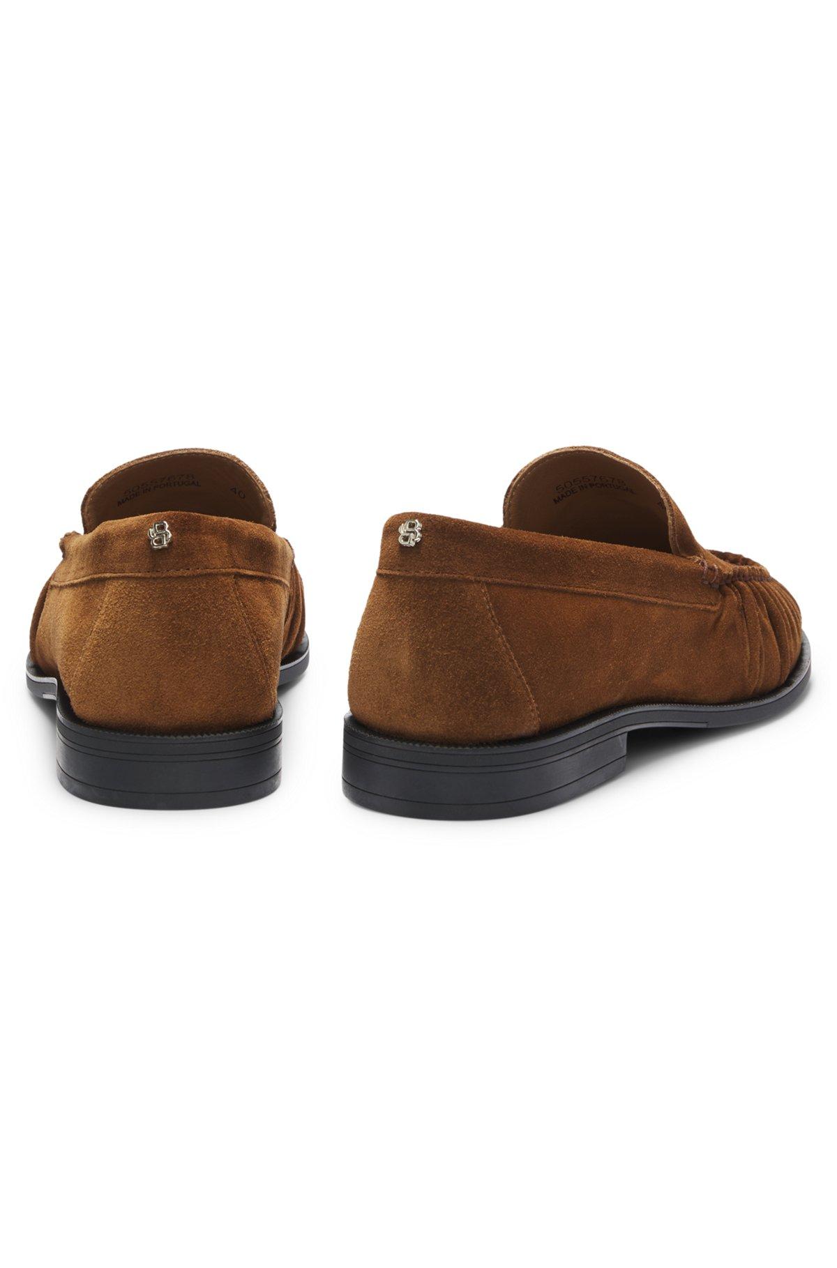 Updating a classic with textured ruching, these suede BOSS Womenswear loafers are a modern must. Gold-tone Double B monogram on heel.