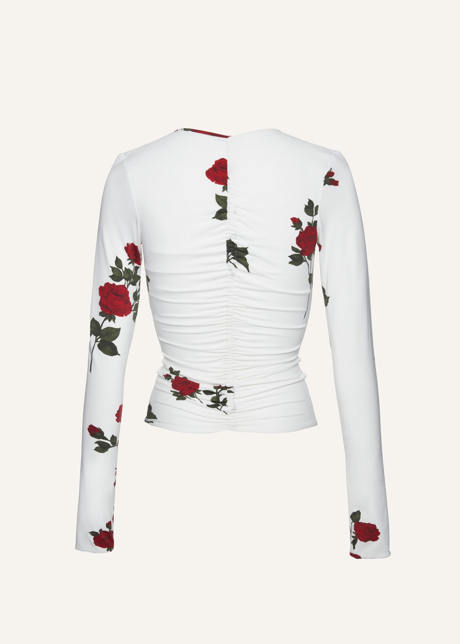 Cut from Magda's signature rose print jersey, this long sleeve top features a v neckline which gives way to center ruching down the front of the torso, which is further embellished with rose appliqués.