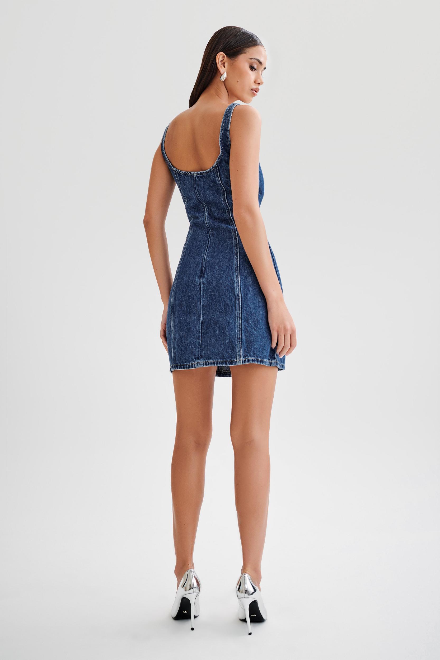 Dressed to the 90's. The RUE Denim Mini Dress is a reimagining of the classic-90s denim mini. Made out of our panelled deep blue MESHKI denim and contoured to fit your form, it's the perfect wardrobe staple for day-to-night dressing. Pair with your favourite sneakers and then slip into the Lara Rose Satin Heels to elevate the look.