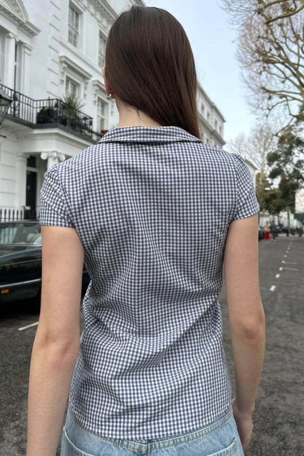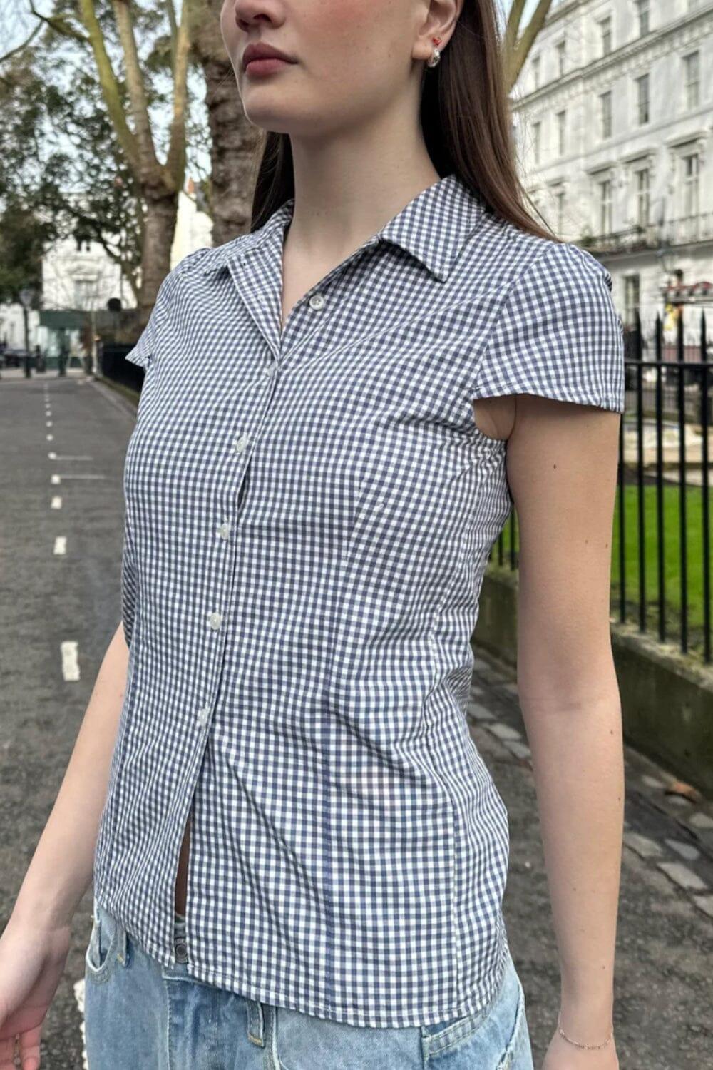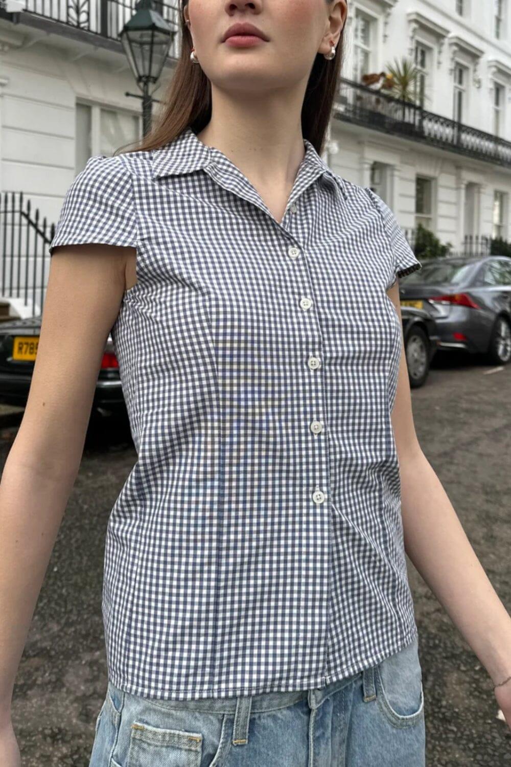 Slim-fit short sleeve button up cotton collared shirt blue with white plaid.Fabrics: 100% cottonMeasurements: 25" (64cm) length, 18" (46cm) bustMade in: China