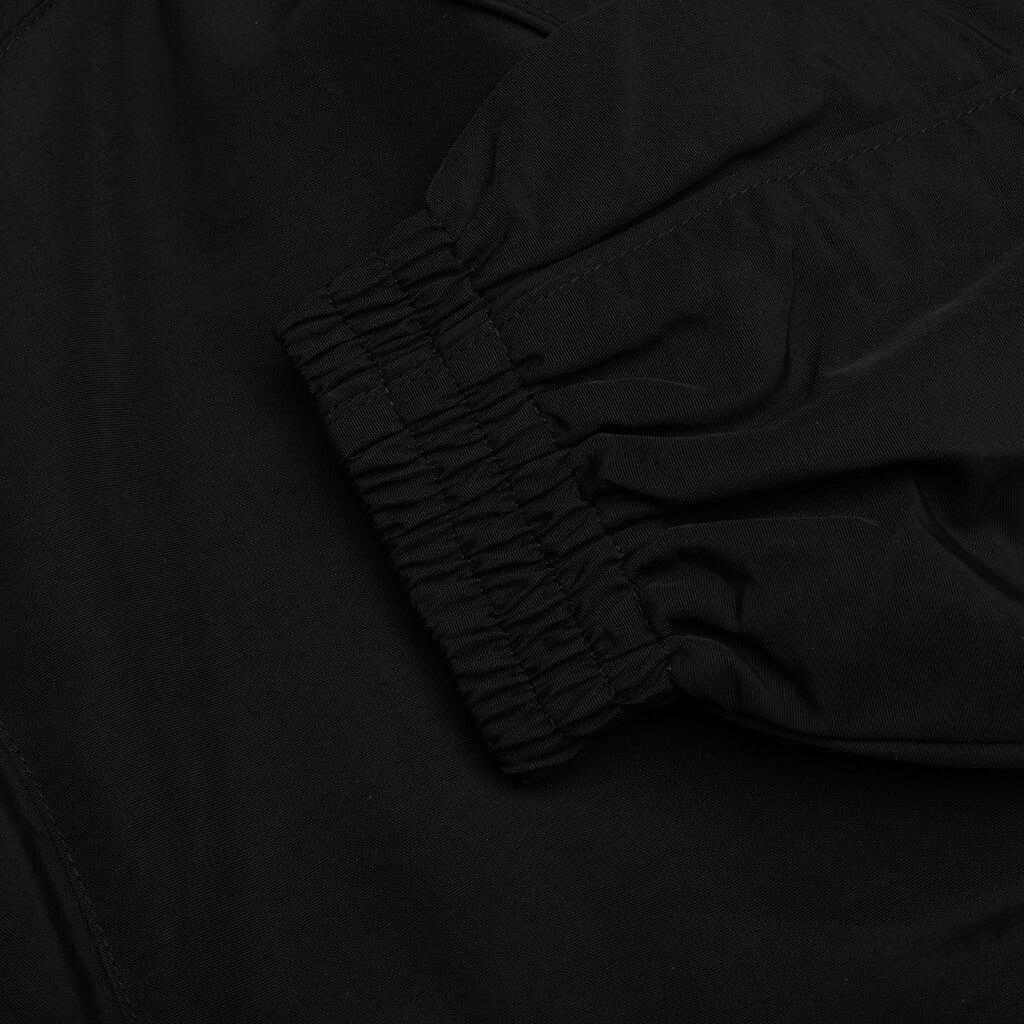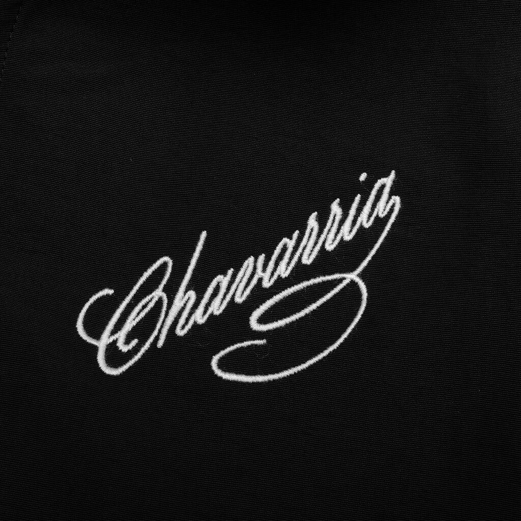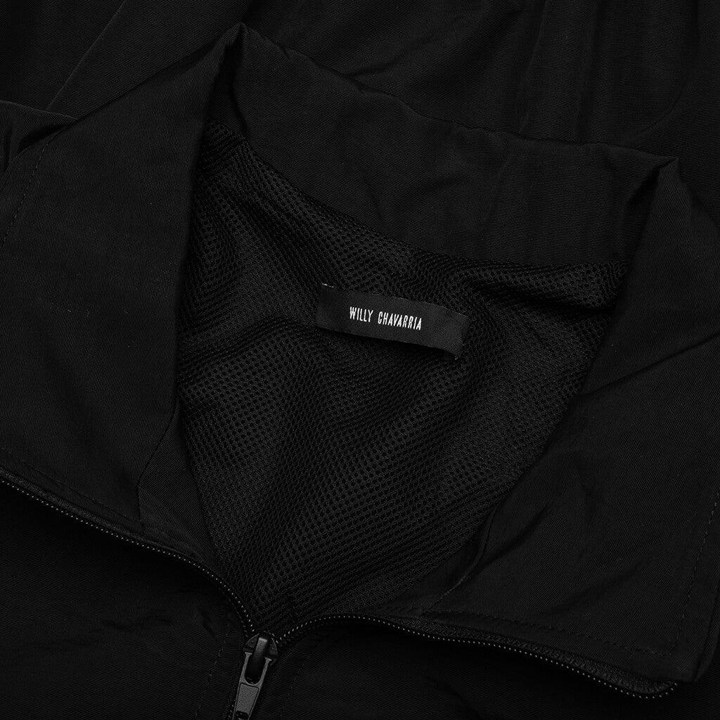 The Willy Chavarria Ruff Rider Track Jacket is crafted from 100% nylon with a 100% polyester mesh lining for breathability. Featuring a chevron panel accented with piping, it offers a modern silhouette with a standing collar and full zip closure. Elastic self-faced waistband and cuffs ensure a secure fit, while two zip pockets and an embroidered script logo on the left chest complete the refined look. 100% Nylon Lining: 100% Polyester Chevron panel with piping detail Mesh lining Elastic self-faced waistband and cuffs Full zip closure with standing collar Two zip pockets Embroidered script logo on left chest Style No: WCJKT0014-001