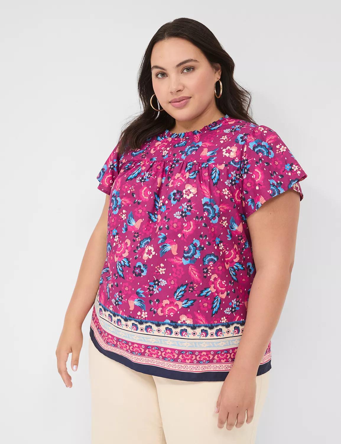 Available in Plus Size A classically chic top, designed in breathable poplin fabric with flirty ruffles & flutter sleeves. Perfect for both weekday professional and weekend-with-denim cool. Crew-neck with ruffle. Short flutter sleeves. Smooth, breathable poplin fabric. Standard length. Single-button keyhole back closure. Item Number #407406Front Body Length From Shoulder: 29.5 (On Size 18) Imported Plus Size Top . Plus Size Ruffle Crew-Neck Blouse, in Magenta Floral, 22, Womens, Lane Bryant
