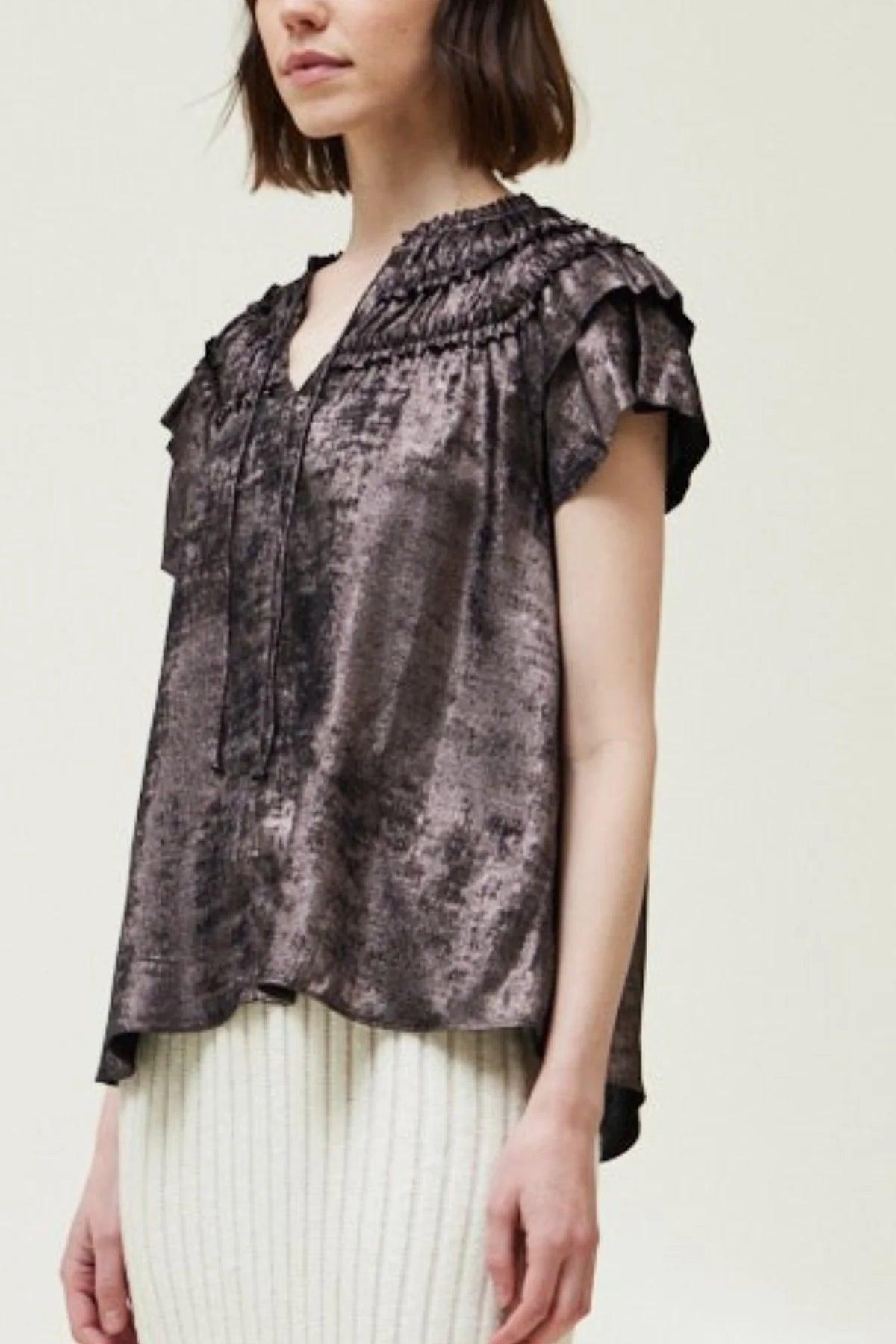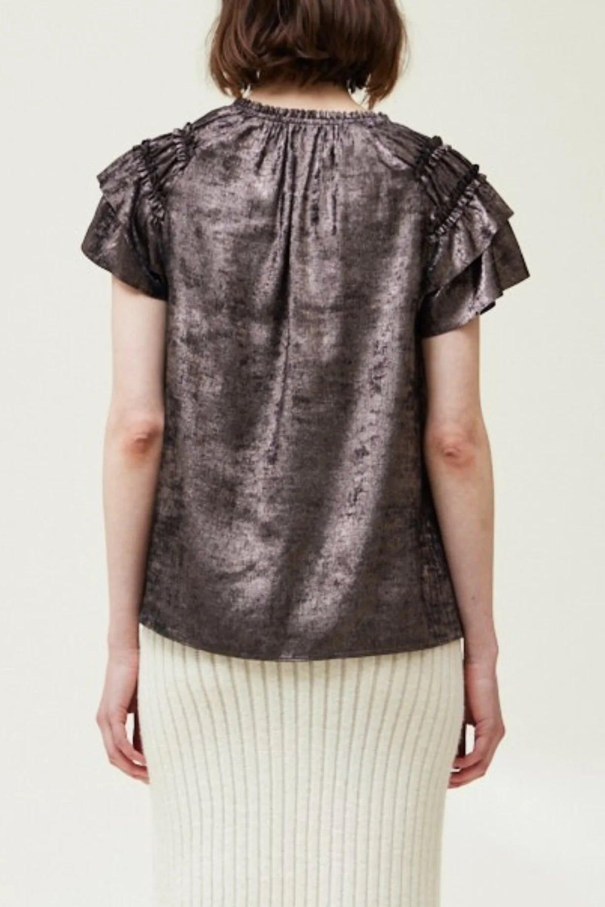 Add a touch of glamour to your wardrobe with this Shimmering Ruffle Detail Blouse. This top features a stunning metallic finish that catches the light beautifully, making it perfect for both daytime sophistication and evening elegance. The delicate ruffle detailing along the yoke and shoulders adds a soft, romantic flair, while the subtle flutter sleeves provide a breezy, relaxed silhouette. The tie-front neckline adds versatility—wear it tied for a polished look or leave it open for effortless charm.