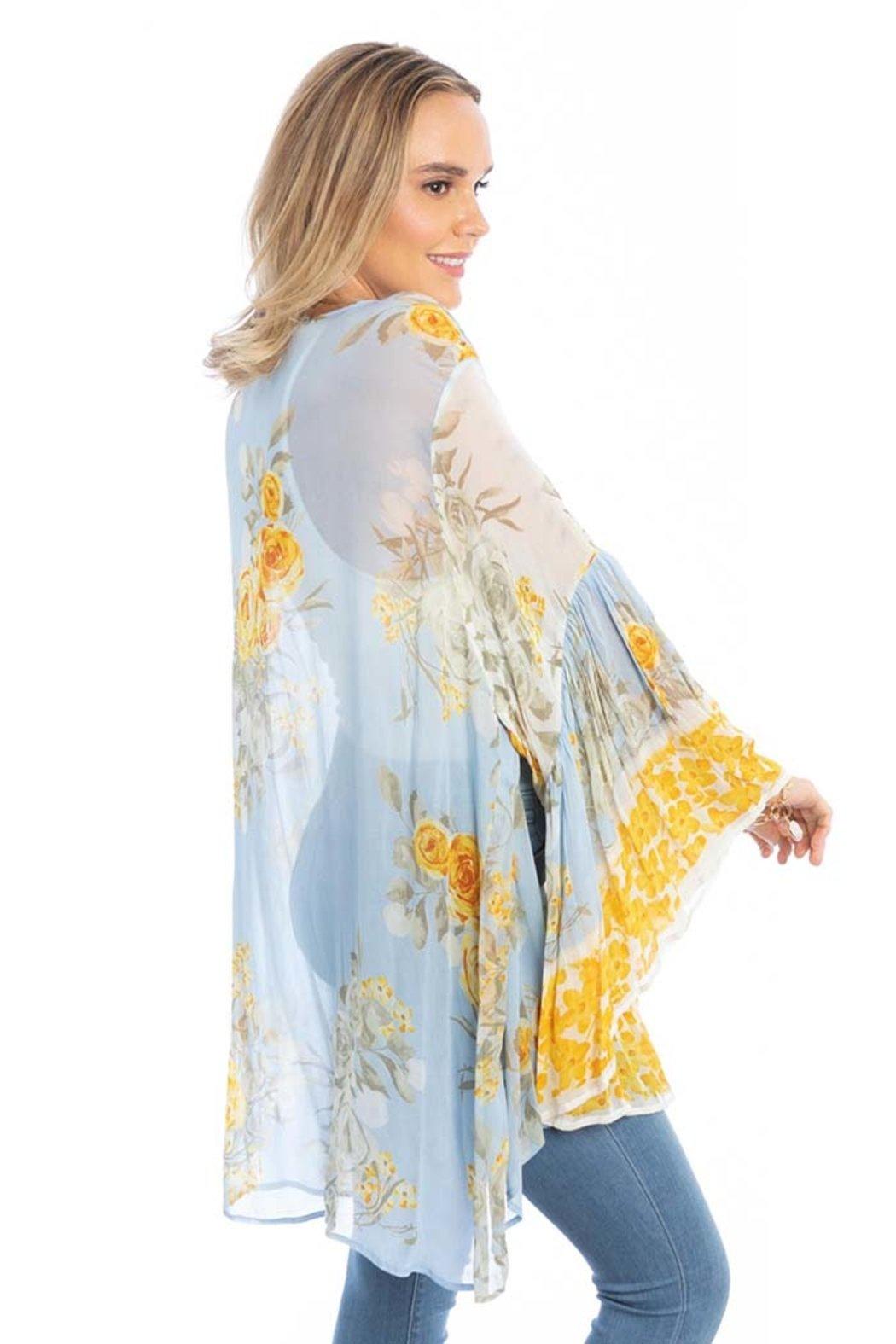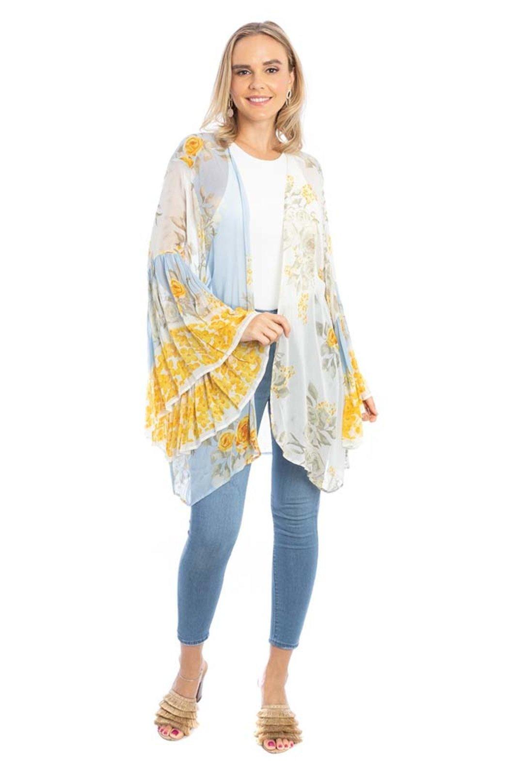 Add a pop of color to your wardrobe with the Mystical Garden Ruffle Sleeve Kimono. Detailed with lush floral print all over, its lightweight fabric with ruffle sleeves and an open front provide an effortlessly stylish layer for spring and summer. Elevate your warm weather looks with this Kimono while staying staying cool and chic.