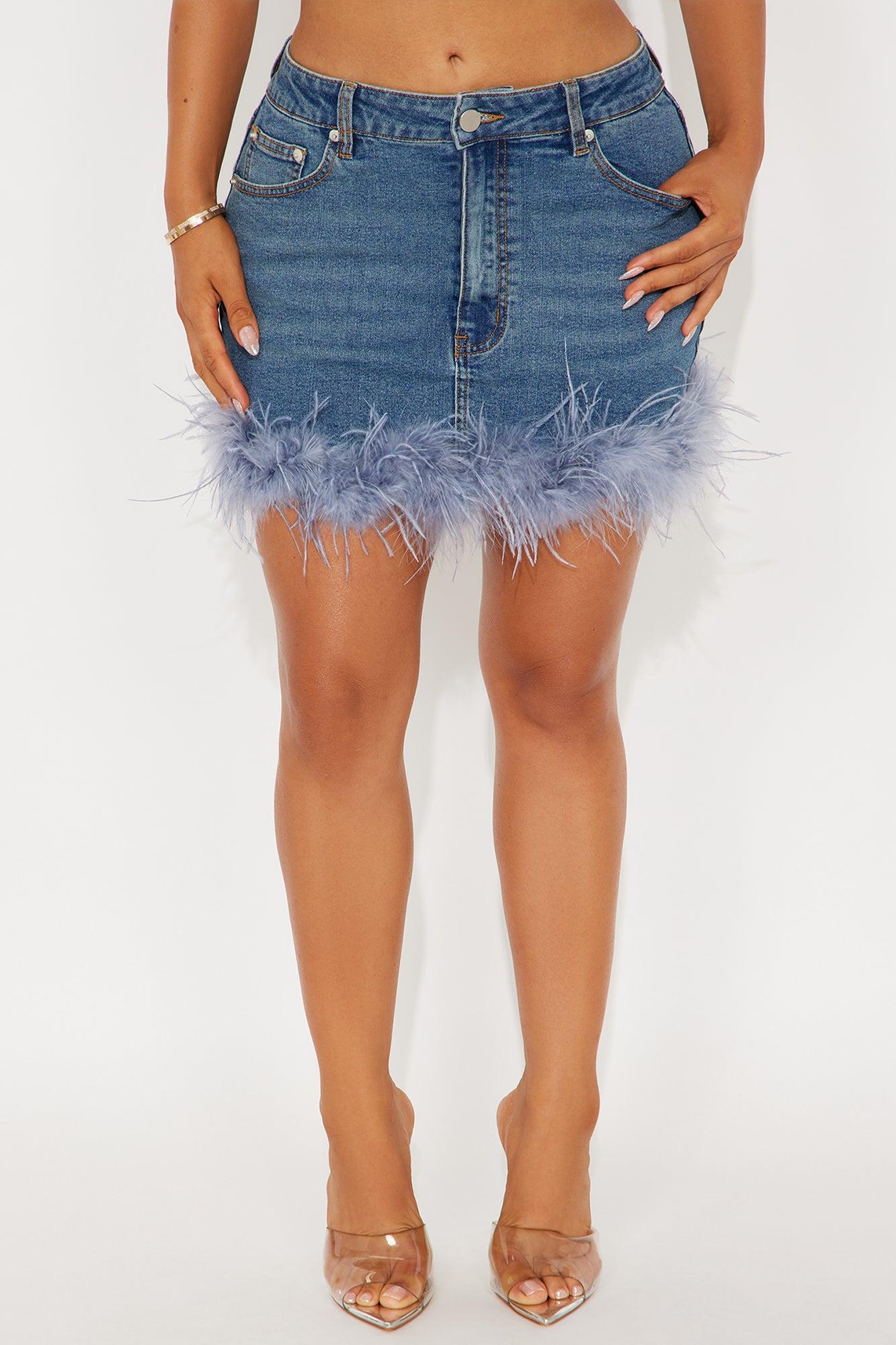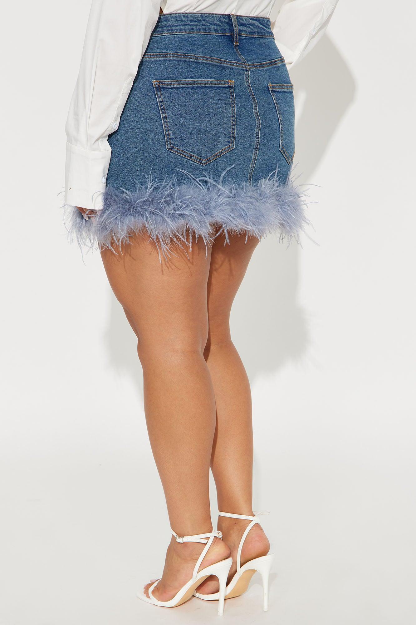 Available In Medium Wash. Mini Skirt Button and Zipper Closure Mid Rise Feather Trim Hem Denim Stretch 12" Length Disclaimer: Feather Fall Out May Happen Shell: 75% Cotton 23% Polyester 2% Spandex Decoration : 60% Turkey Feather 40% Ostrich Feather Imported