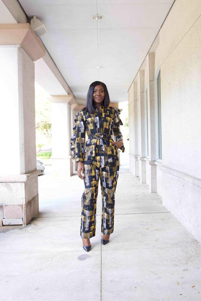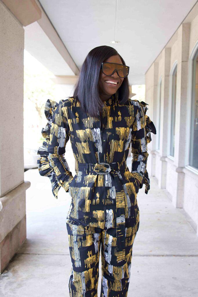 This Ruffled Jumpsuit features stylish ruffled shoulders atop a classic black base, with a touch of white and gold for a modern, sophisticated look. The versatile design makes it great for both casual and formal occasions.