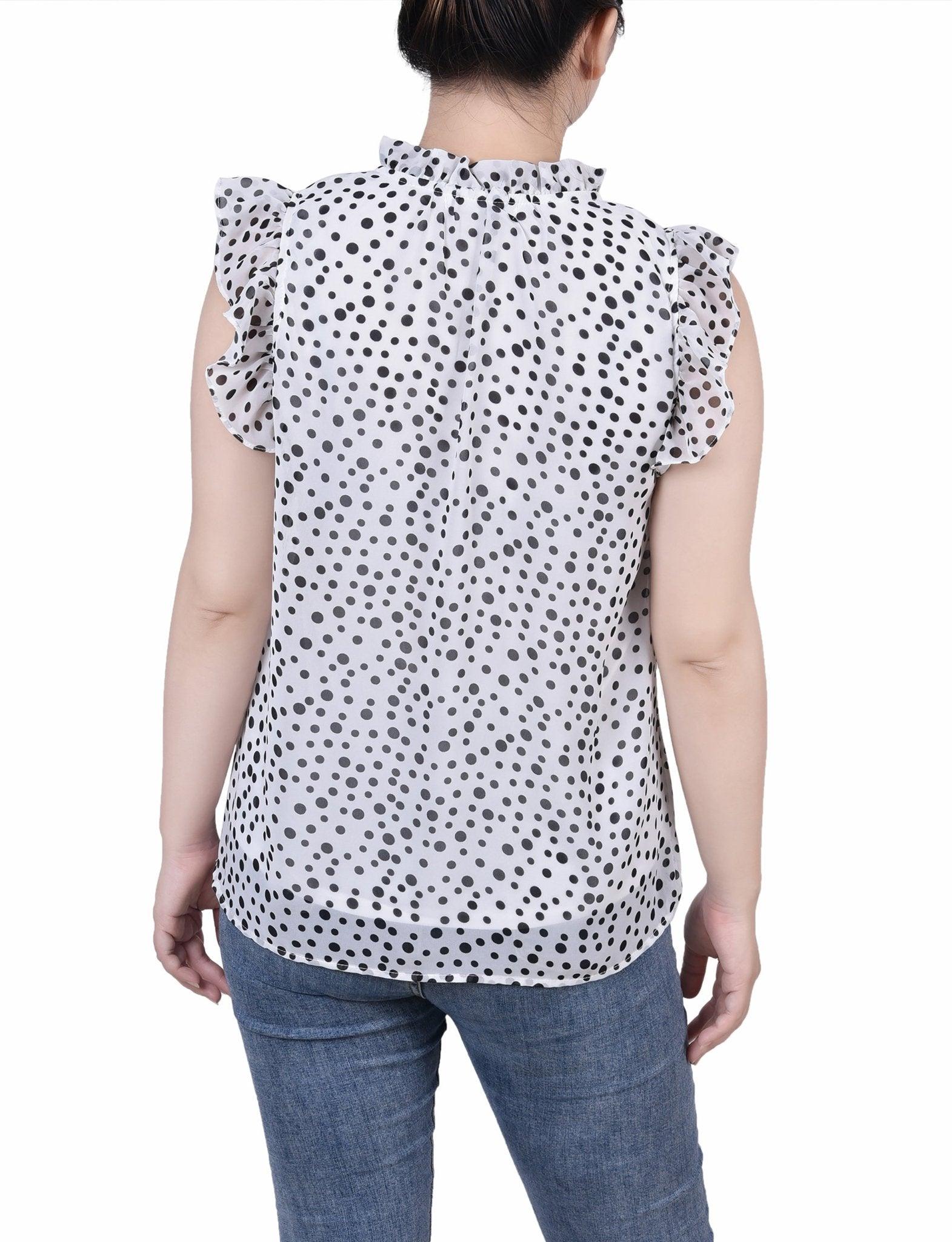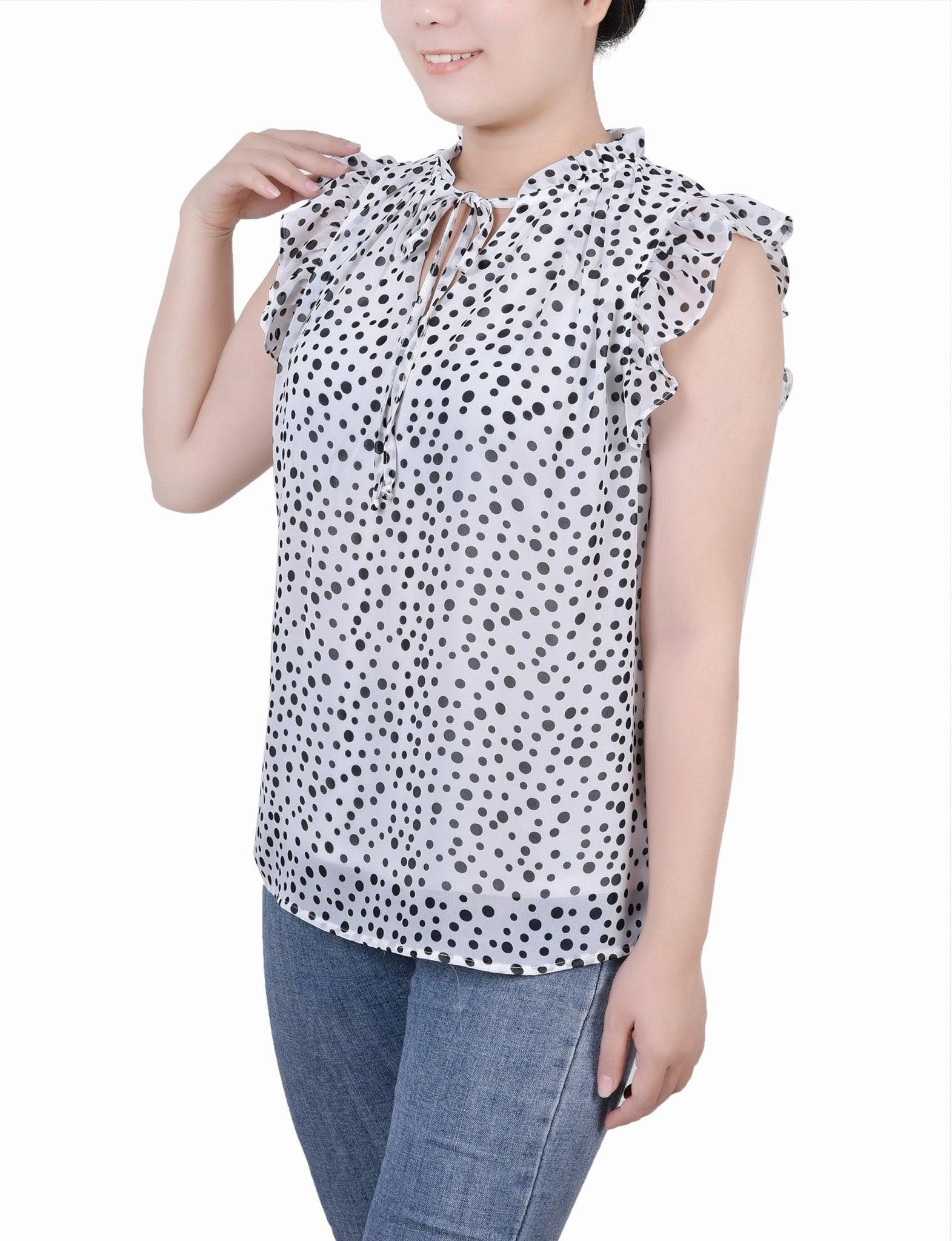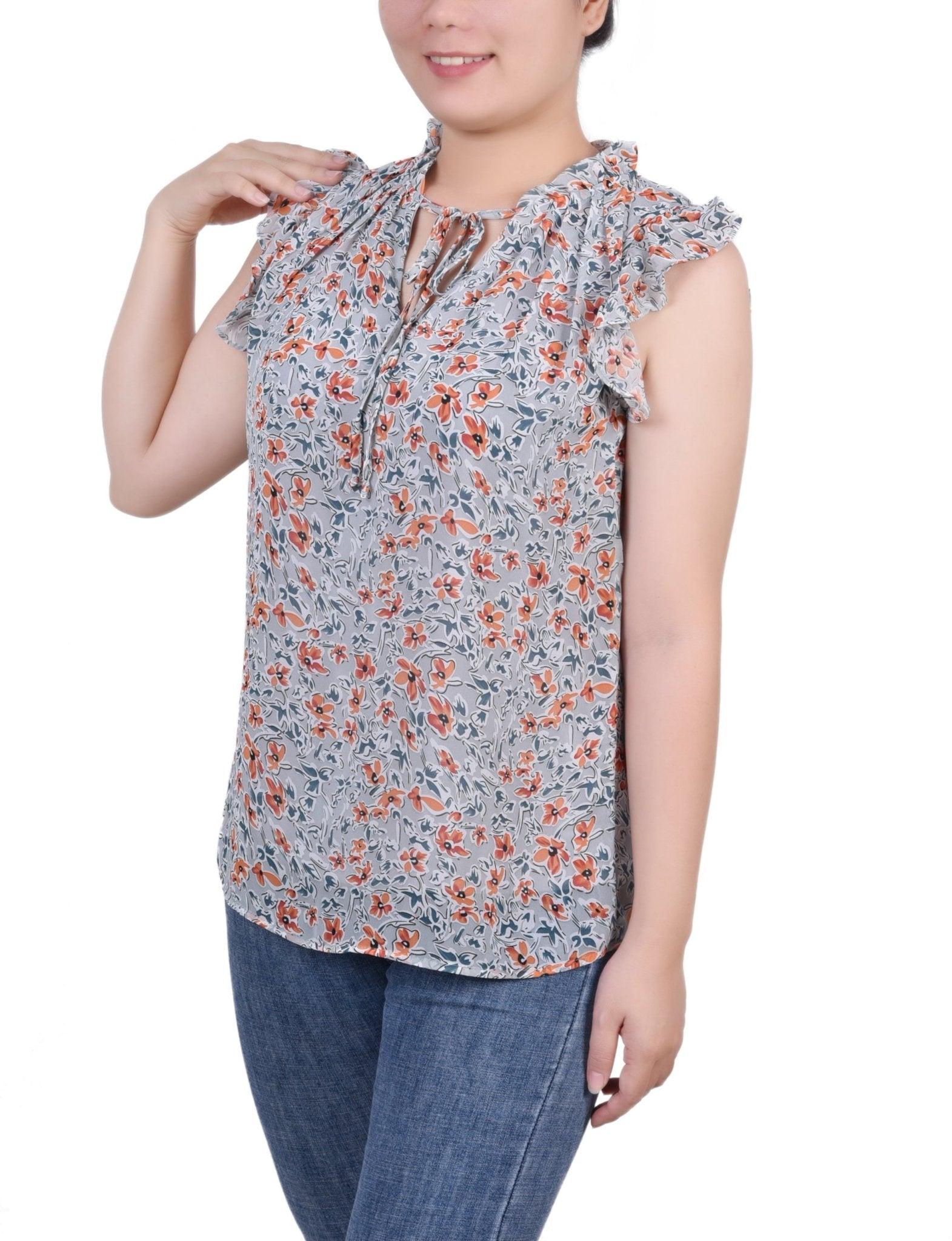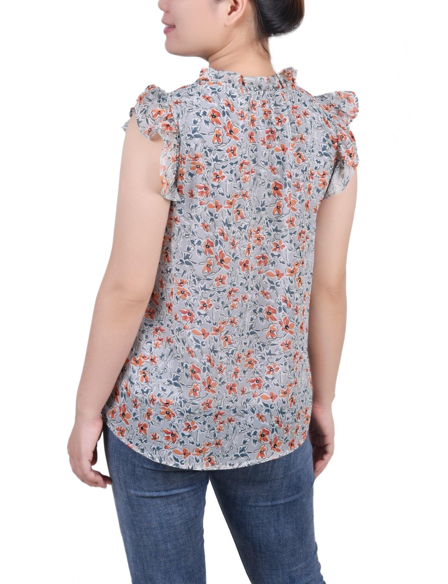 Frilly and flirty. That's what you call this chiffon blouse from NY Collection. Goes great with jeans or dressed up with a skirt. -Material: Body: 100% Polyester, Lining: 100% Polyester -Care Instructions: Machine Washable -Product Fit: Relaxed Fit Product Specifications: -Short Ruffled Sleeve -Mandarin Collar With Tie Closure -Keyhole Front -Denier Lined -Chiffon