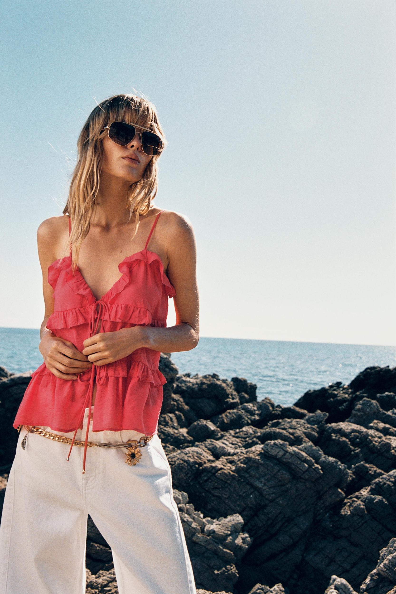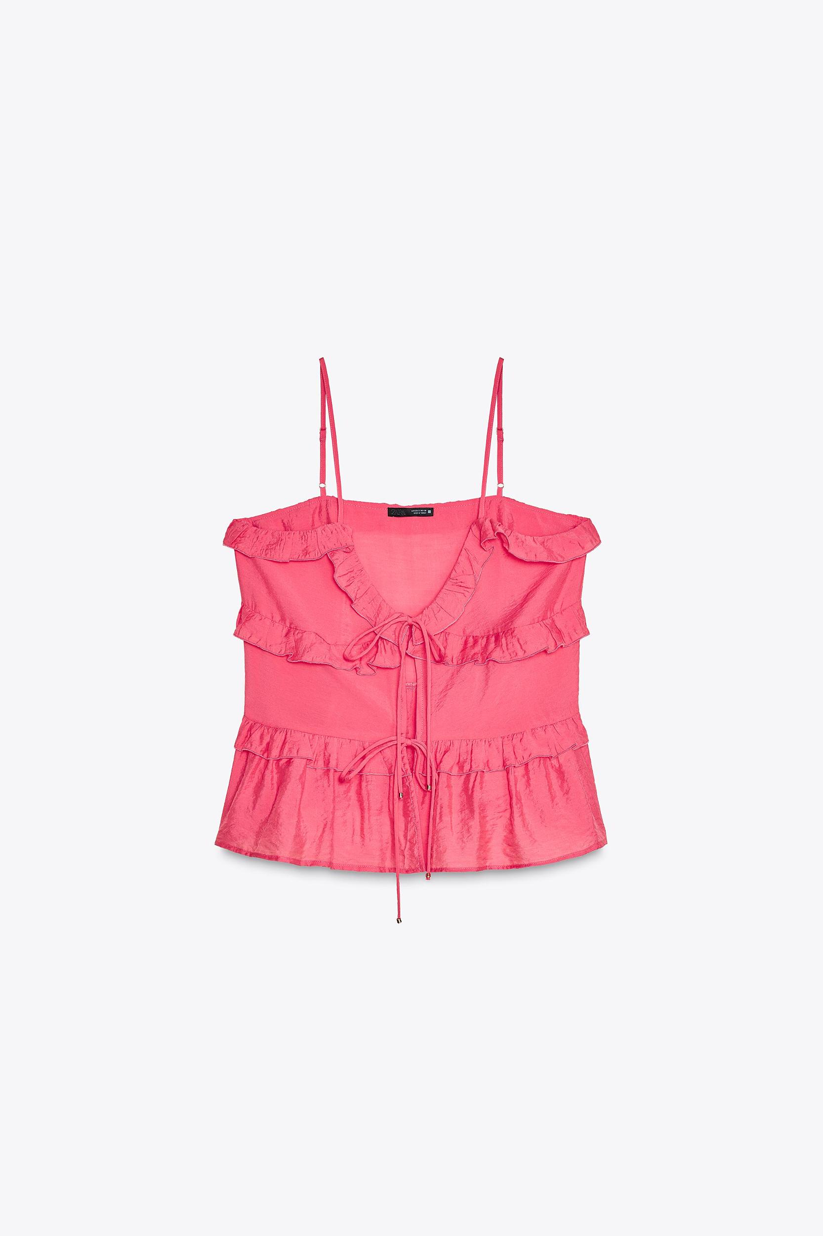 V-neck top with adjustable spaghetti straps. Ruffle detail. Front tie closure.