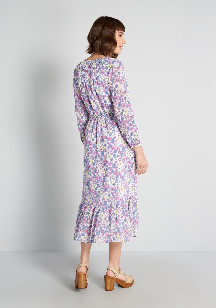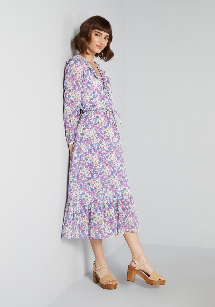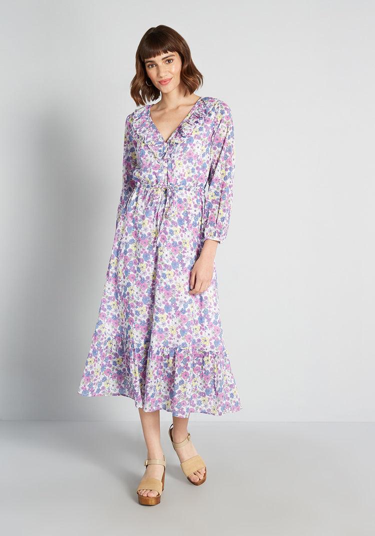 Feel ultra-romantic in our ModCloth namesake label 1970s-inspired midi dress. Made from a lightweight, airy cotton gauze that is covered with our exclusive, prairie-inspired floral print made-up of purple, blue, yellow, and grey hues, that are scattered all over. This easy fit silhouette features cascading ruffle-trim at the V-neckline, decorative button-front, ¾ blouson sleeves, an adjustable drawcord that cinches at the empire waist, and a shirred, tiered ruffle hem, this retro-fab sundress is meant to be an anchor piece for the rest of the sunnier days ahead.Cotton.Machine wash.Fully lined except sheer sleeves. Decorative front buttons.ImportedFabric does not provide stretch. Adjustable drawstring at waist.4=47 inches Length16W=49 inches Length