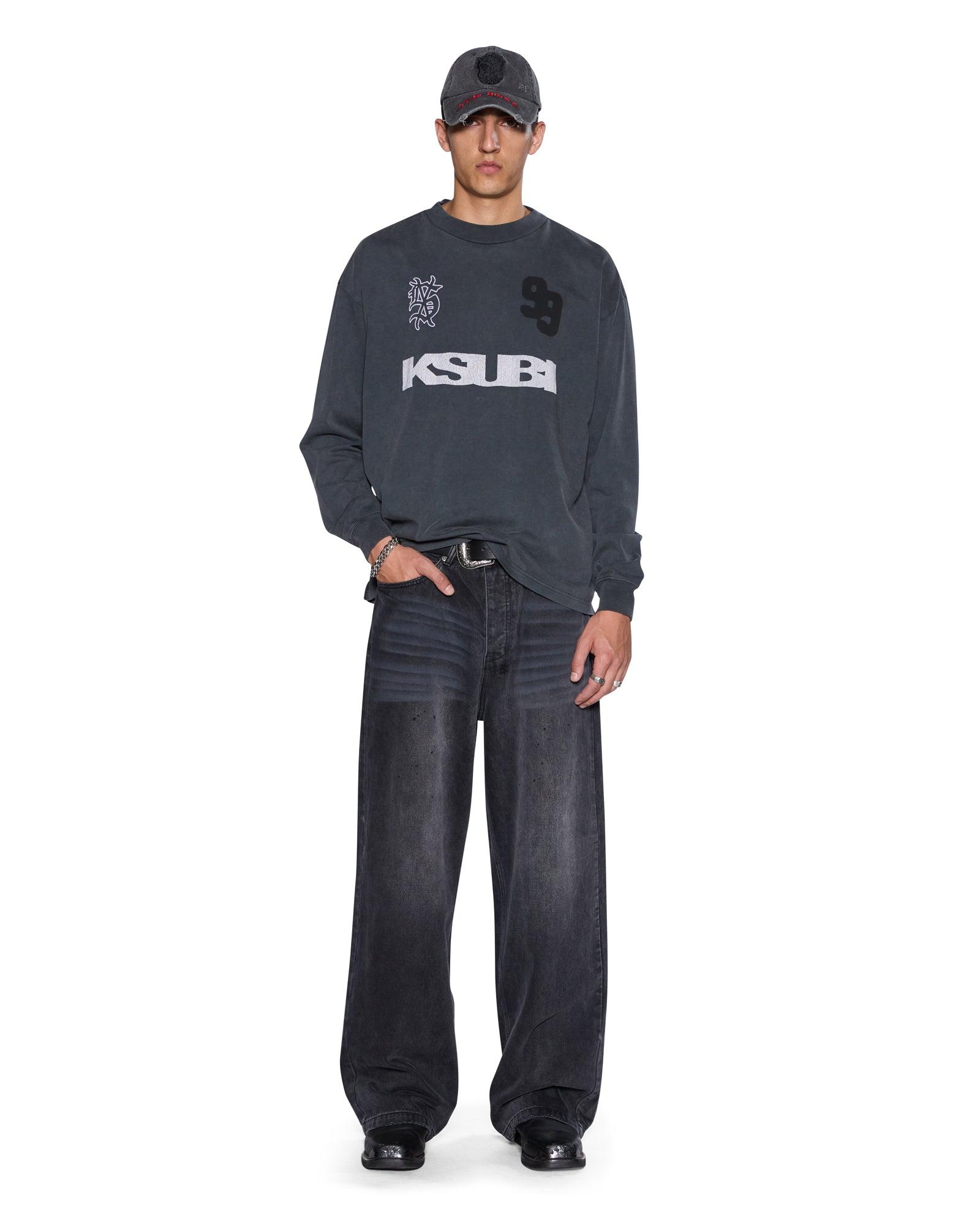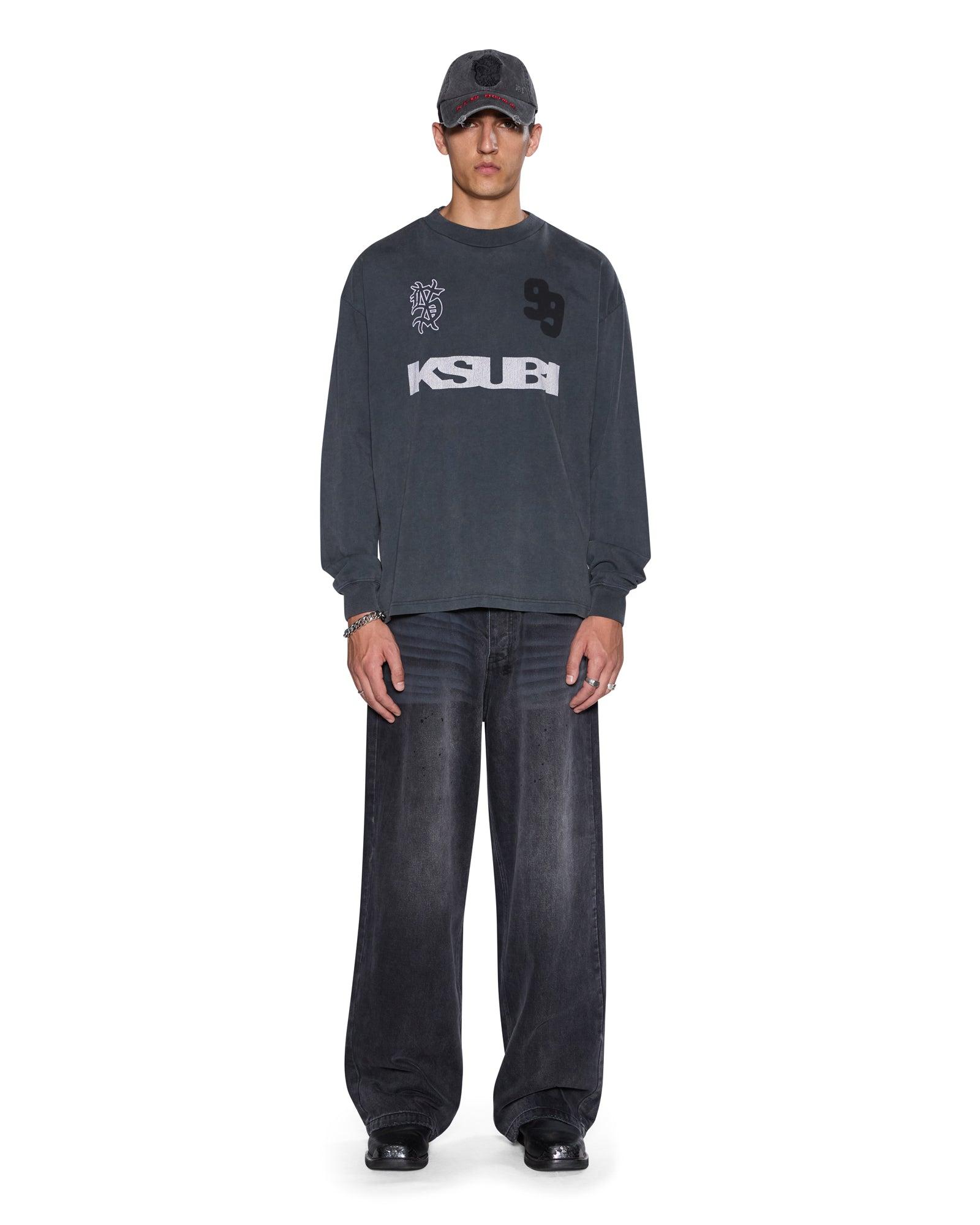 The Rugged Ekcess LS Tee is a boxy, long sleeve t-shirt with dropped shoulders and a raw cut back hem. Crafted from premium cotton jersey garment dyed vintage blue, it showcases reversed overlocked side seams, signature rats tail, seasonal artwork at the front, and a sprayed high/low appearance. Finished with T-box and 4x4 embroidery branding.
