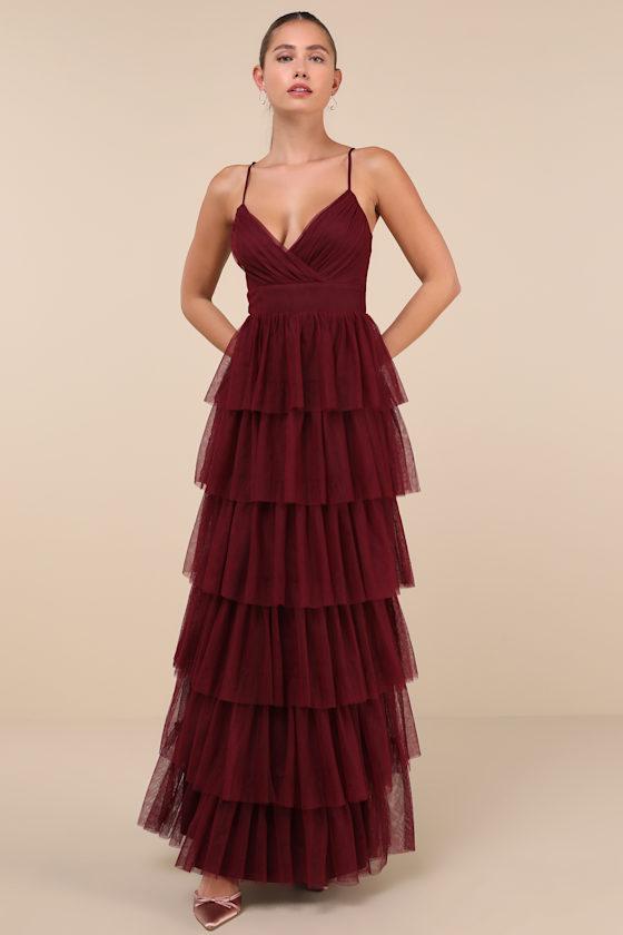 Treat any event like your own personal fashion show when you're wearing a show-stopping look like the Lulus Rule the Runway Burgundy Tulle Surplice Tiered Maxi Dress! This stunning dress is composed of sheer tulle-like mesh (atop a stretch knit lining) that shapes a pleated, sleeveless bodice, a flattering surplice neckline, and adjustable spaghetti straps. The high, banded waist tops an A-line maxi skirt, adorned with fluffy tiers of tulle that are sure to make you look "tulle-y" mesmerizing as you dance the night away! Hidden back zipper/clasp.