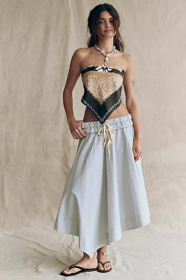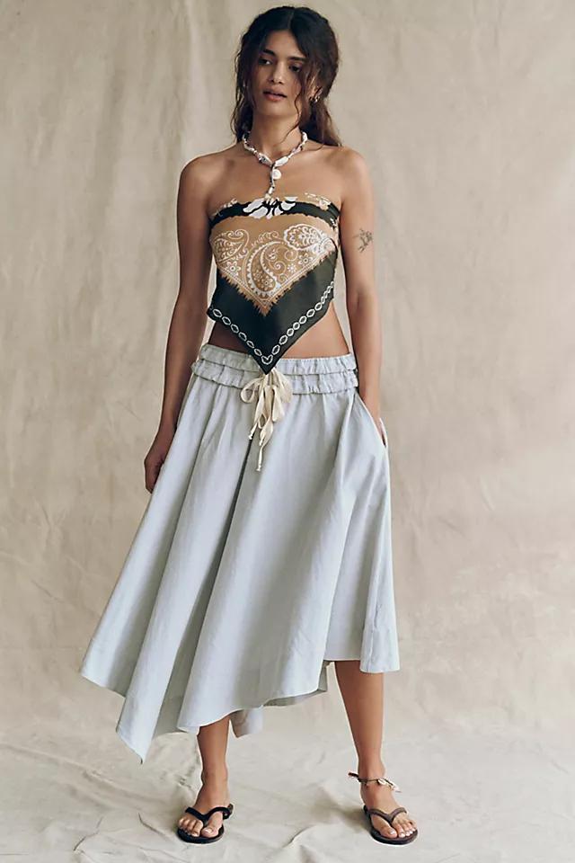 So floaty in the perfect A-line fit, this midi skirt from free-est features a crisp cotton poplin with a pointed front hem and double-drawstring waistband.
