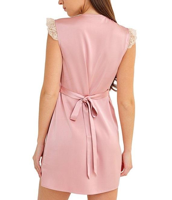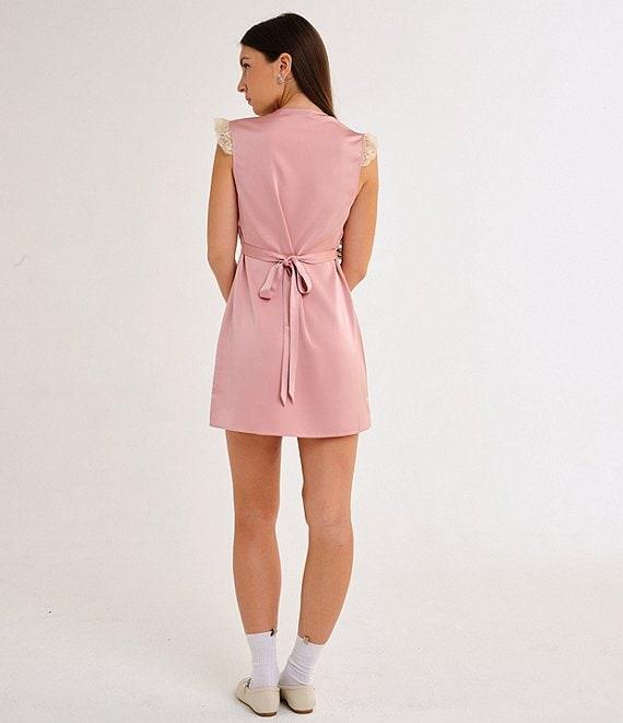 From Rumored, this dress features: V-neckline Sleeveless Tie front detail Lace trim detail Mini length Lyocell (tencel) Dry clean Imported.