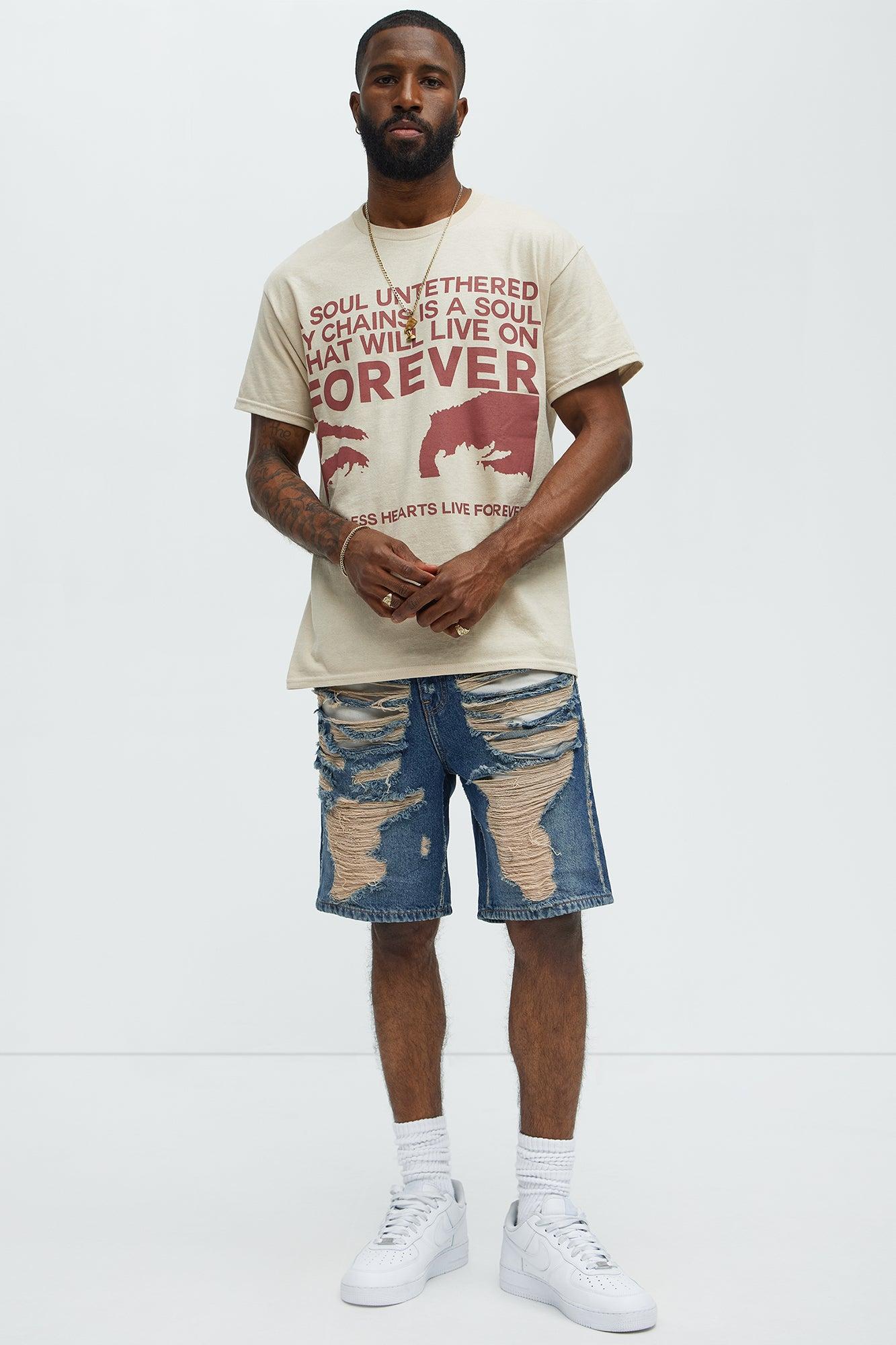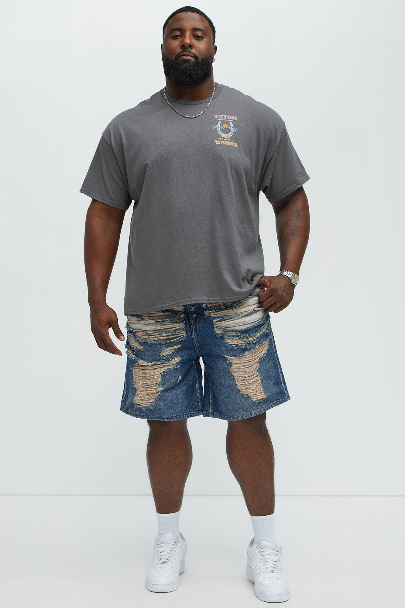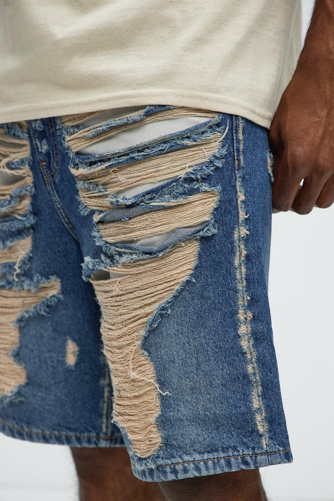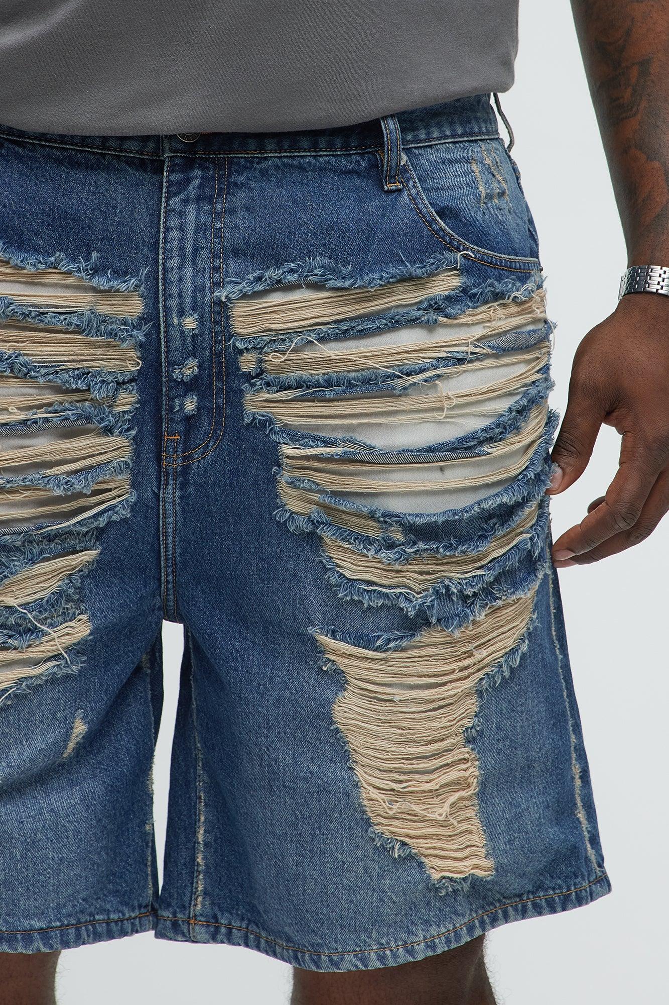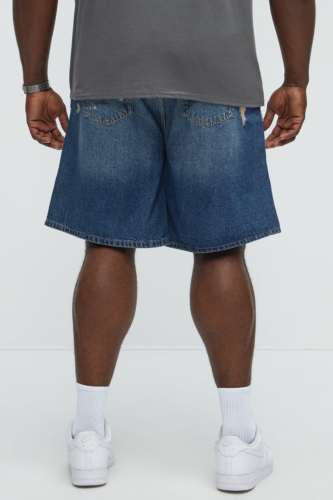 Run It Up Relaxed Distressed Denim Shorts - Medium Blue Wash