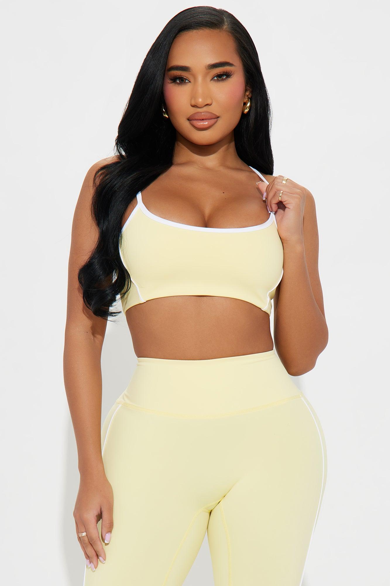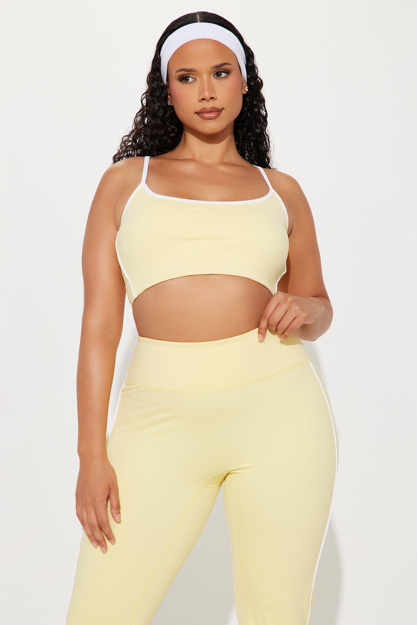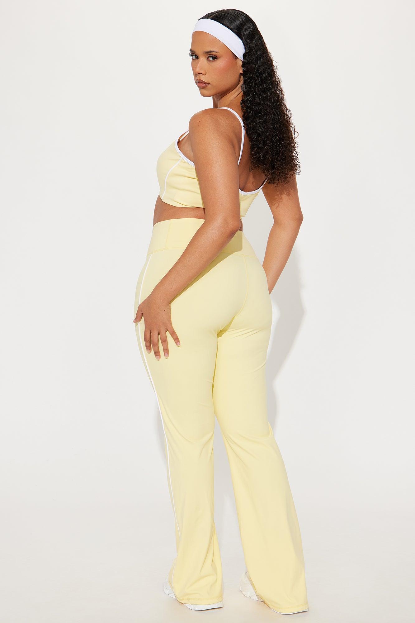 Available In Black And Butter Yellow. Active Set Sports Bra Scoop Neck Sleeveless Active Yoga Pant High Waisted Elastic Waistband 32" Inseam Compression Contrast Trim Low Impact Stretch 75% Nylon 25% Spandex California Proposition 65WARNING: Cancer and Reproductive Harm - www.P65Warnings.ca.gov.