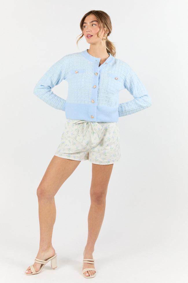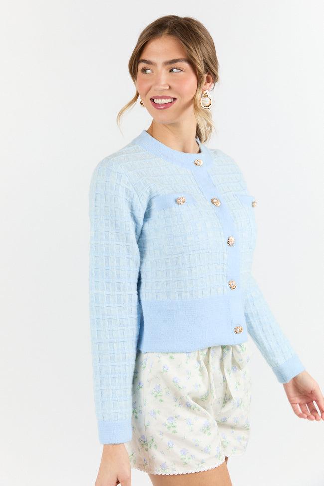 Crew neckline, functional button up closure, functional pockets, long sleeves