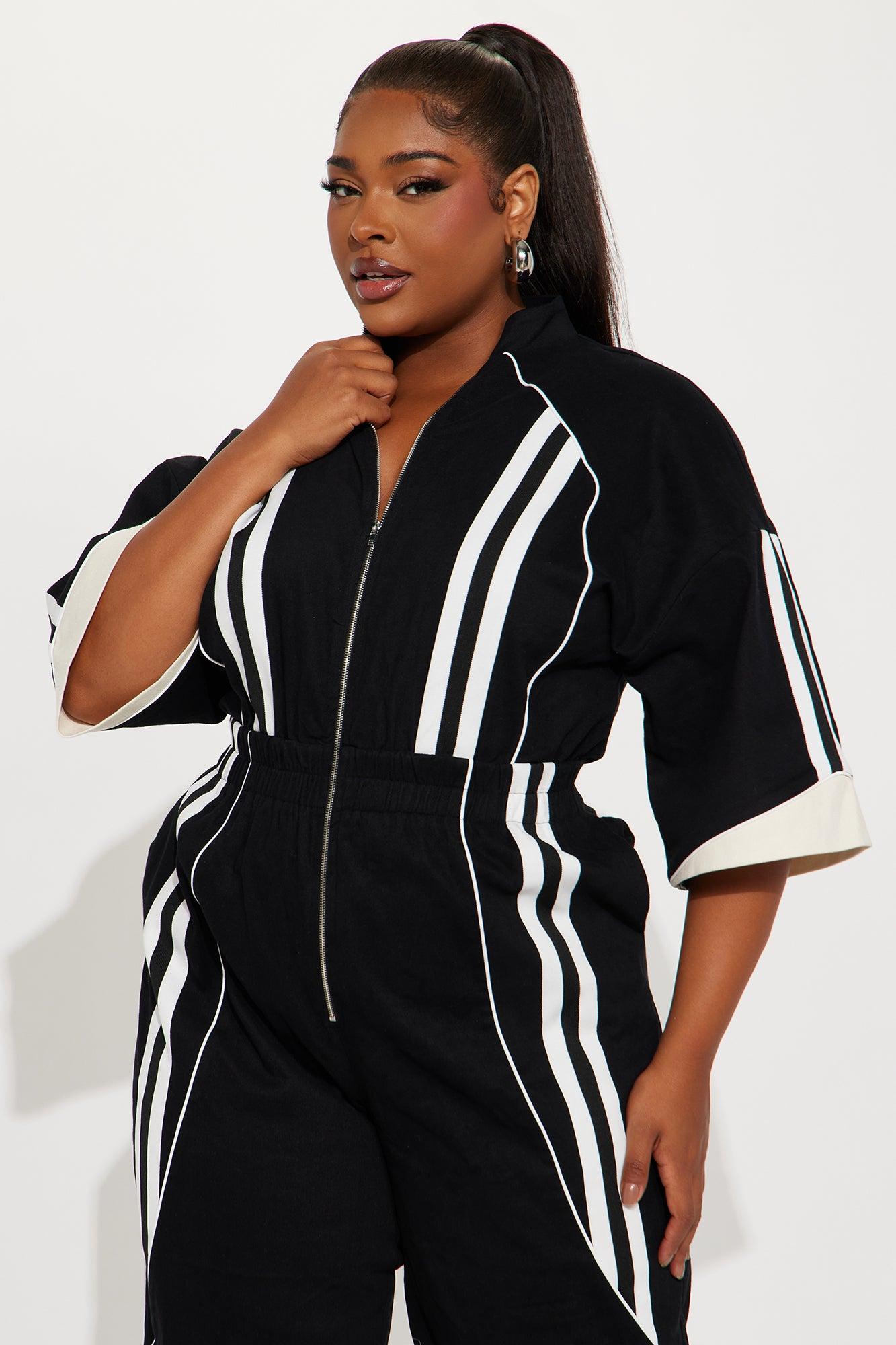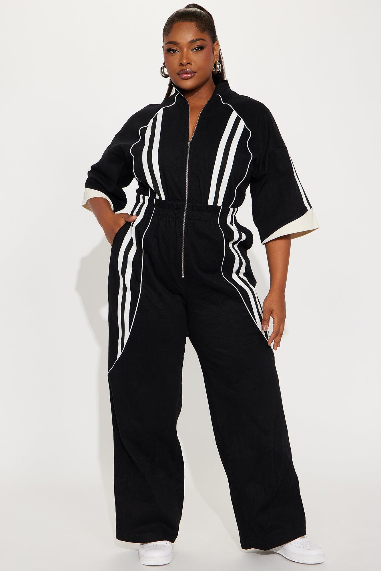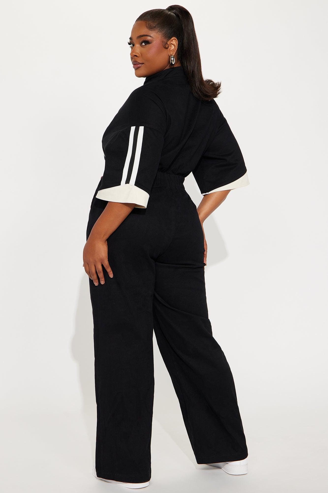 Available In Black. Jumpsuit 3/4 Sleeve Mock Neck Zip Front Elastic Waistband Wide Leg Non Stretch Self: 97% Cotton 3% Spandex Contrast: 97% Cotton 3% Spandex Lining: 100% Polyester Imported California Proposition 65WARNING: Cancer and Reproductive Harm - www.P65Warnings.ca.gov.
